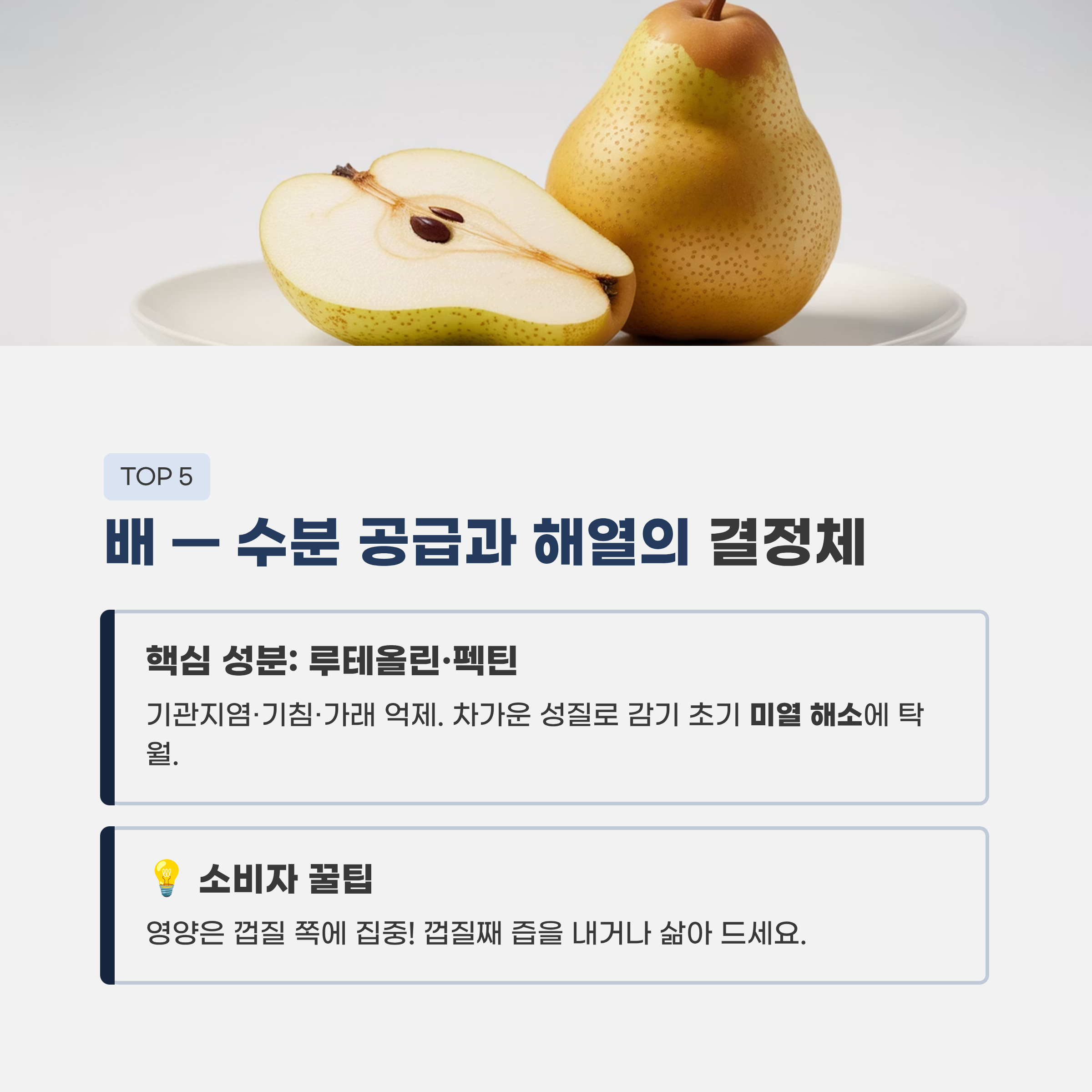 - 소비자 꿀팁: 배의 중심부(씨 부분)보다는 껍질 쪽에 영양이 많습니다. 깨끗이 씻어 껍질째 즙을 내거나 삶아 드세요.