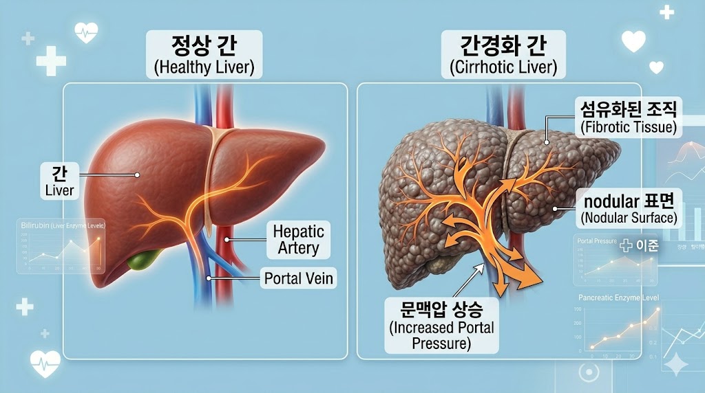 간경화는 간세포가 파괴되고 굳어지면서 간이 딱딱해지는 질환이죠. 이렇게 간이 굳으면 간으로 들어가야 할 혈액들이 제대로 통과하지 못해 문맥압이 높아지게 됩니다. 댐이 막혀 물이 역류하는 것과 비슷한 원리예요.