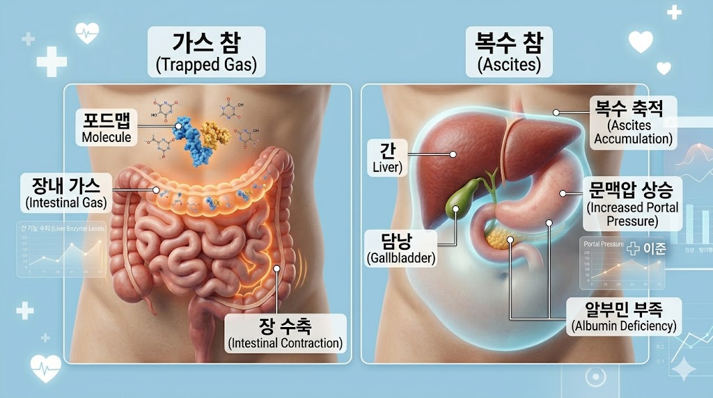 가장 궁금해하실 부분이 바로 "내 배에 든 게 가스일까, 아니면 물(복수)일까?" 하는 점일 거예요. 간경화가 진행되면 간에서 혈액의 삼투압을 조절하는 '알부민'이라는 단백질을 제대로 만들지 못하게 돼요. 그러면 혈액 속 수분이 혈관 밖으로 빠져나와 복강 내에 차게 되는데, 이것을 복수라고 부릅니다.