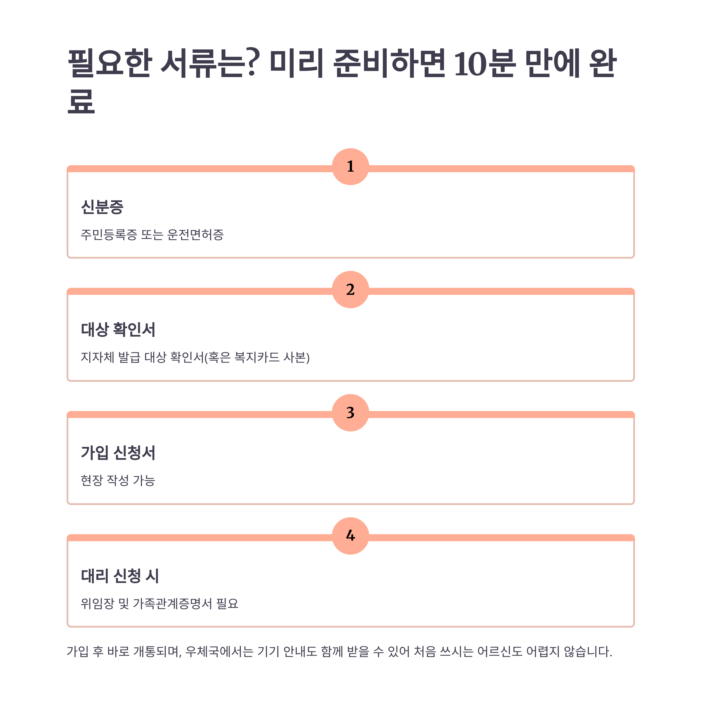 가입 후 바로 개통되며, 우체국에서는 기기 안내도 함께 받을 수 있어 처음 쓰시는 어르신도 어렵지 않습니다.