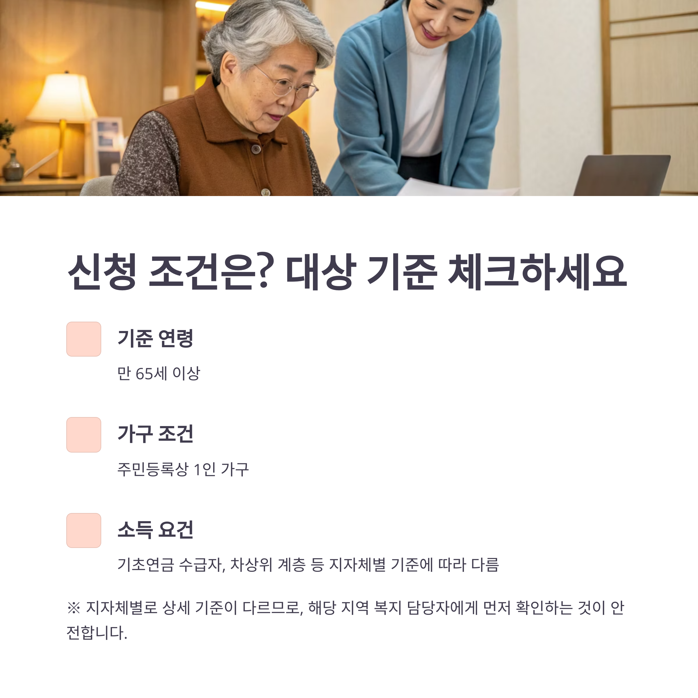 ※ 지자체별로 상세 기준이 다르므로, 해당 지역 복지 담당자에게 먼저 확인하는 것이 안전합니다.