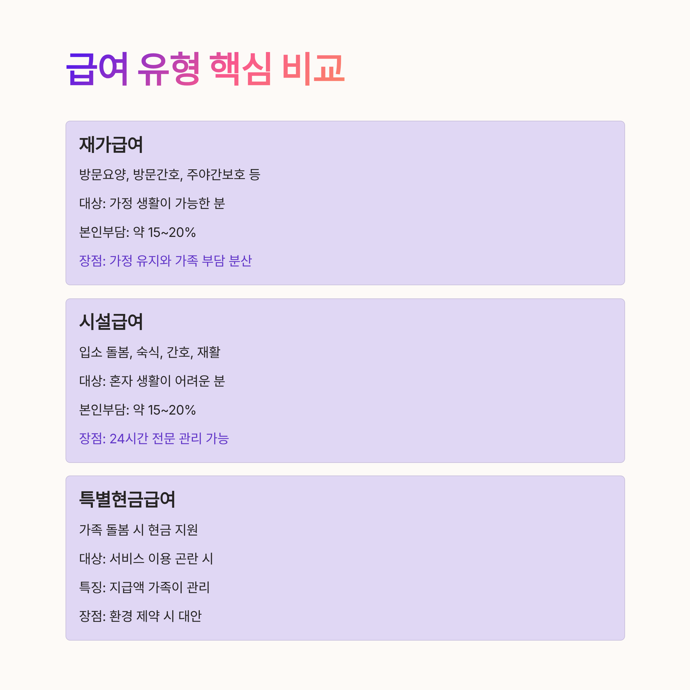 | 특별현금급여 | 가족 돌봄 시 현금 지원 | 서비스 이용 곤란 시 | 지급액 가족이 관리 |
