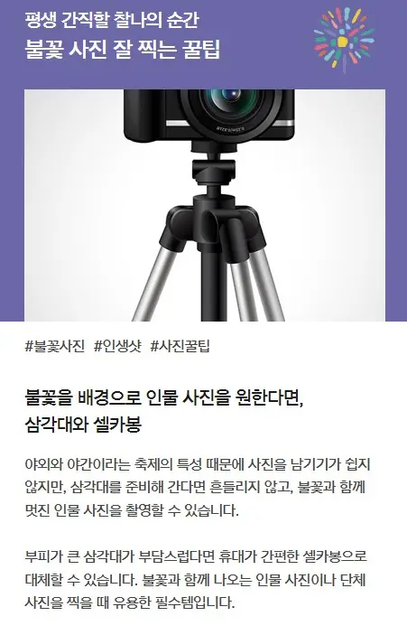 위의 꿀팁들을 활용해 불꽃놀이의 멋진 순간을 완벽하게 사진으로 남겨보세요!