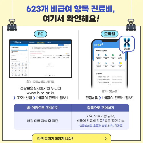 - 건강보험심사평가원 누리집에 접속해 '비급여 진료비 정보' 탭에서 병원별, 지역별, 규모별 항목을 비교해 볼 수 있습니다.