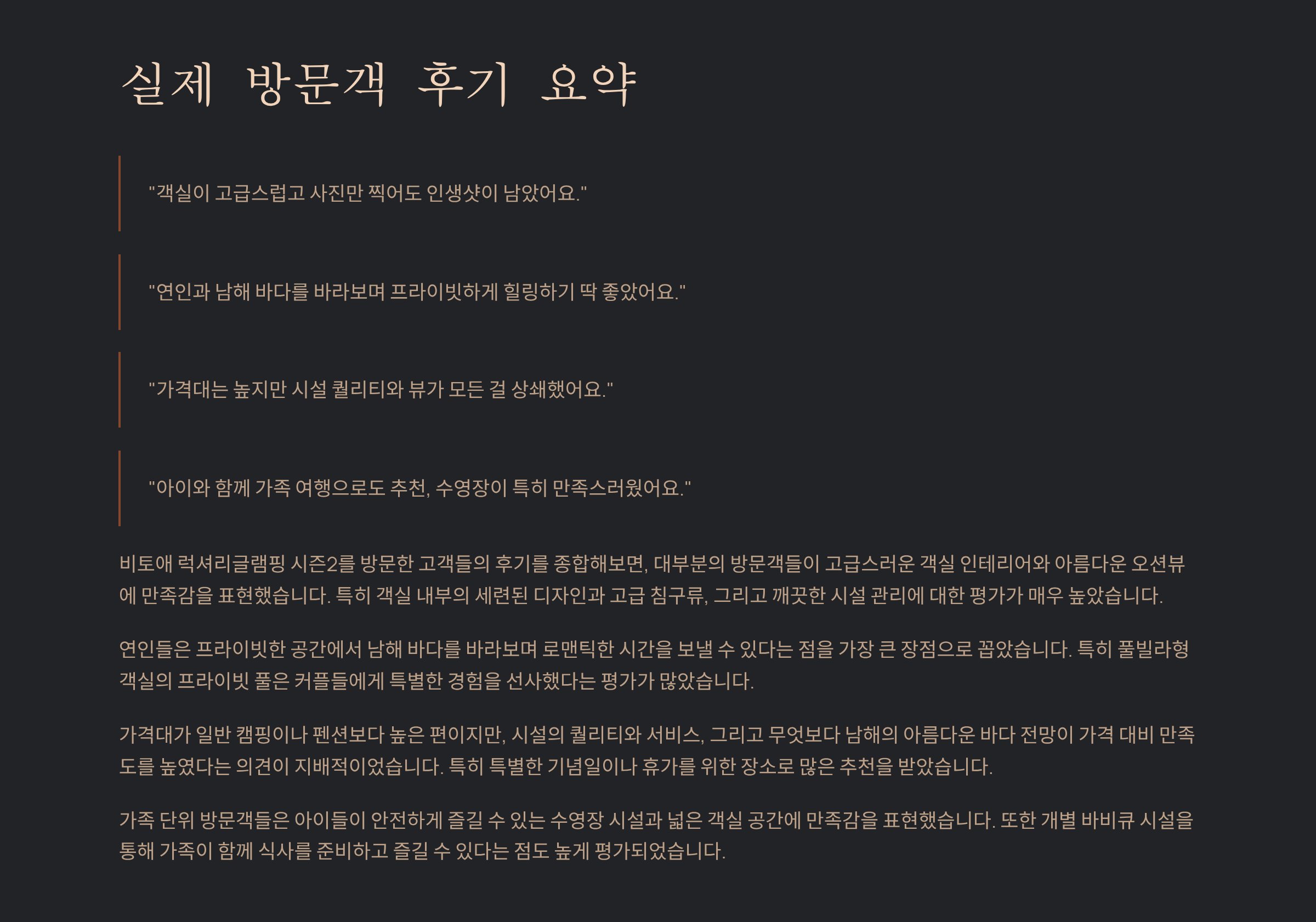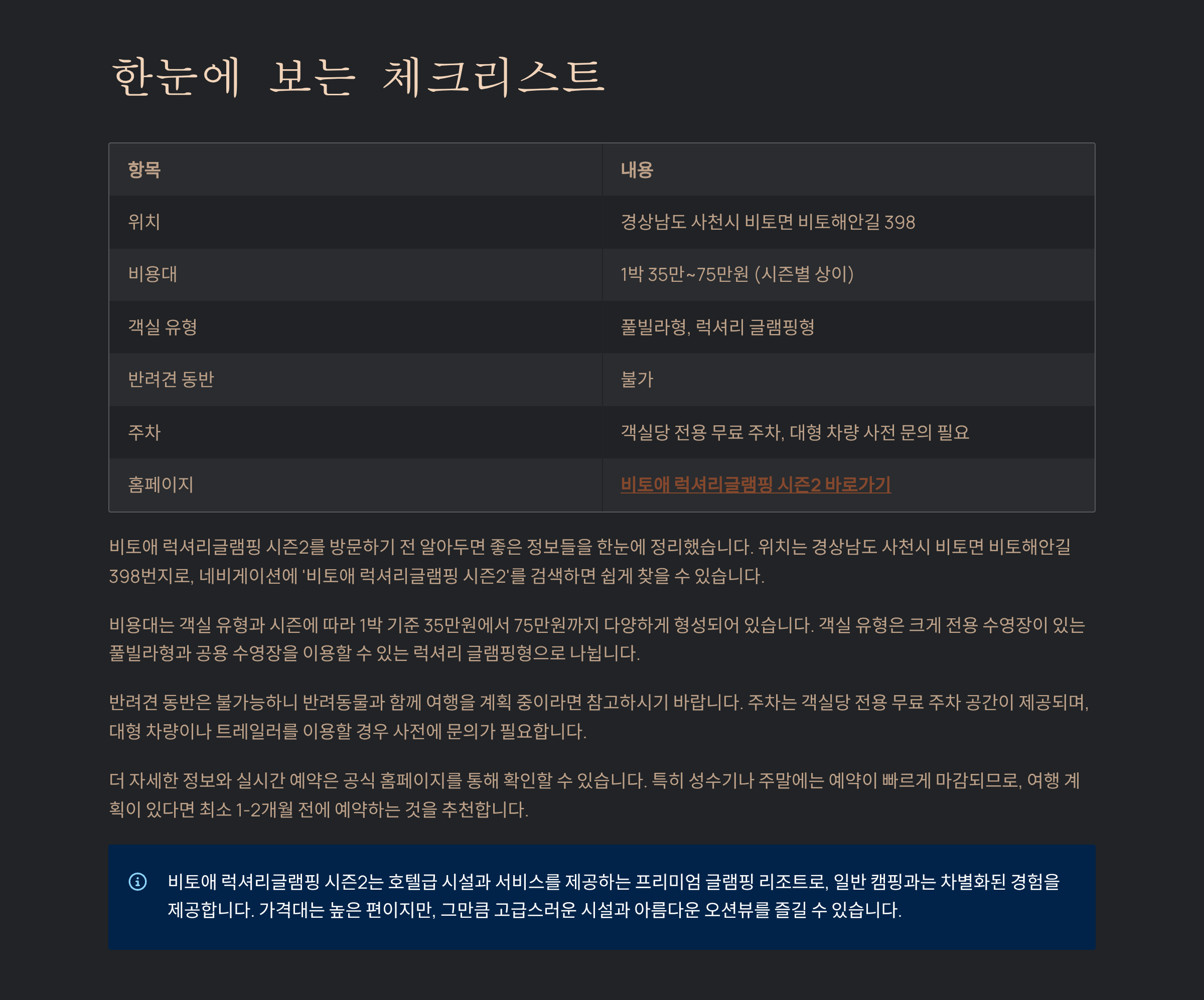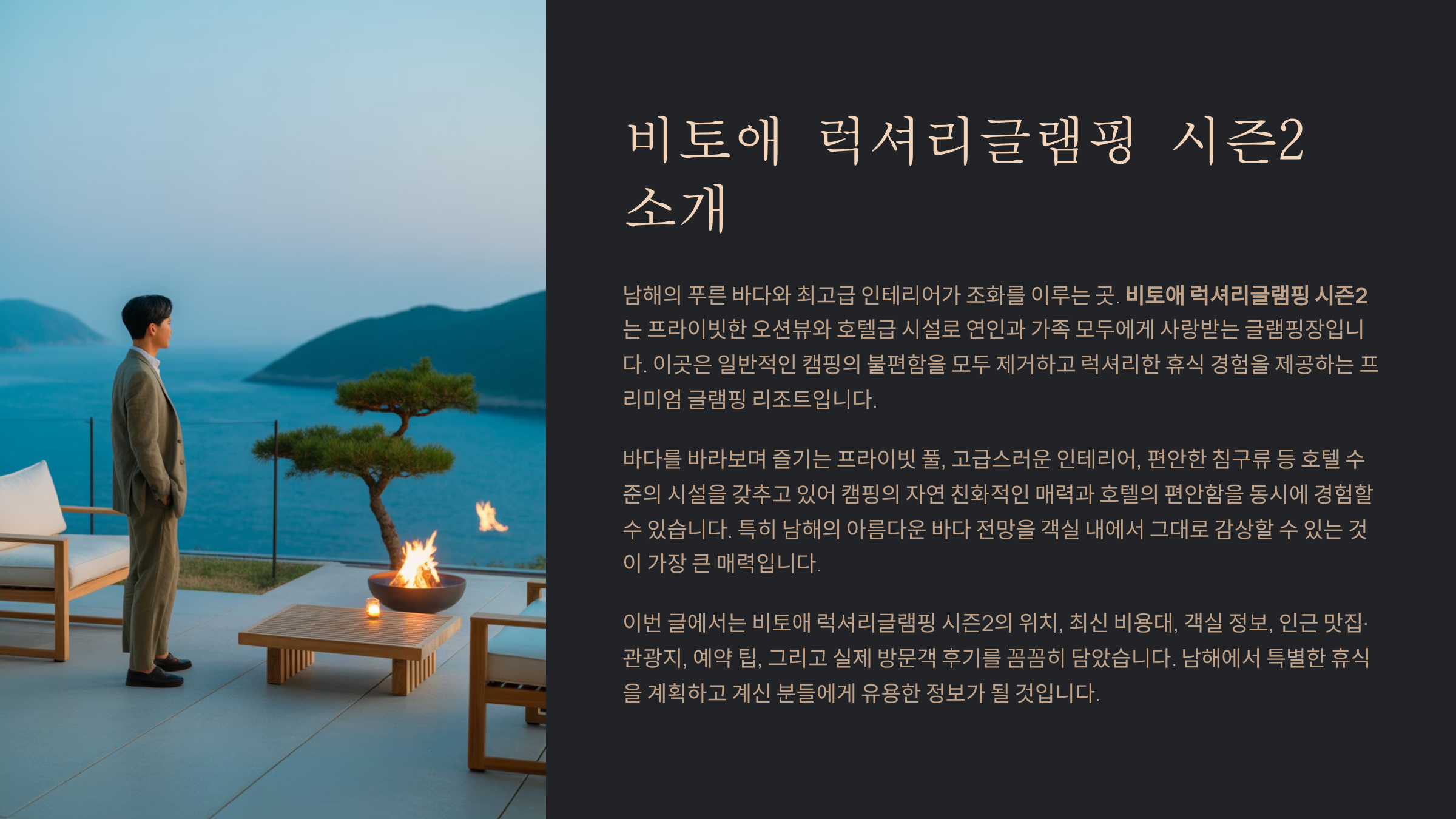 남해의 푸른 바다와 최고급 인테리어가 조화를 이루는 곳. 비토애 럭셔리글램핑 시즌2는 프라이빗한 오션뷰와 호텔급 시설로 연인과 가족 모두에게 사랑받는 글램핑장입니다. 이번 글에서는 위치, 최신 비용대, 객실 정보, 인근 맛집·관광지, 예약 팁, 그리고 실제 방문객 후기를 꼼꼼히 담았습니다.