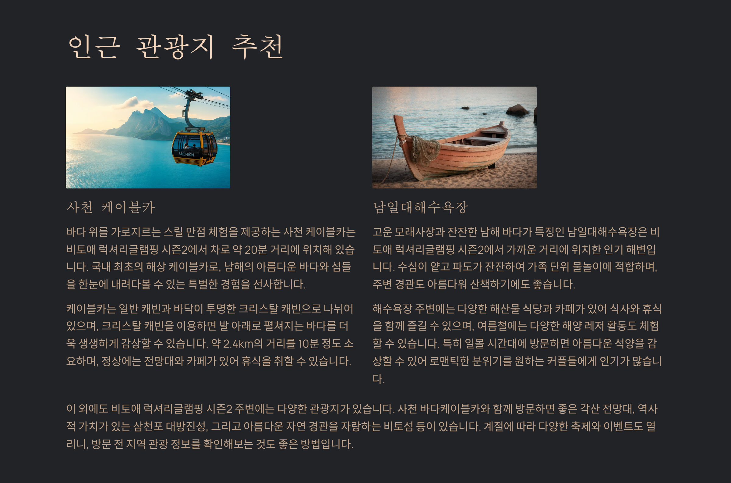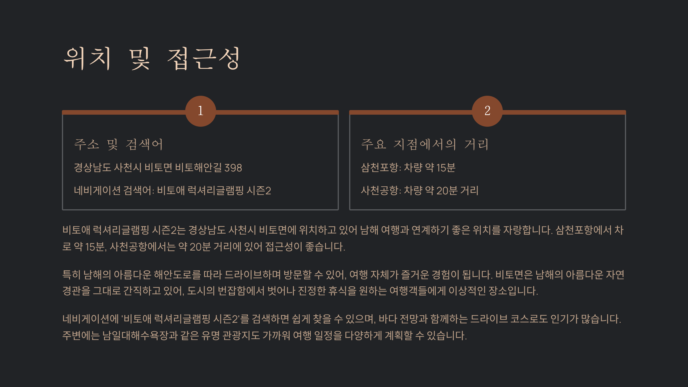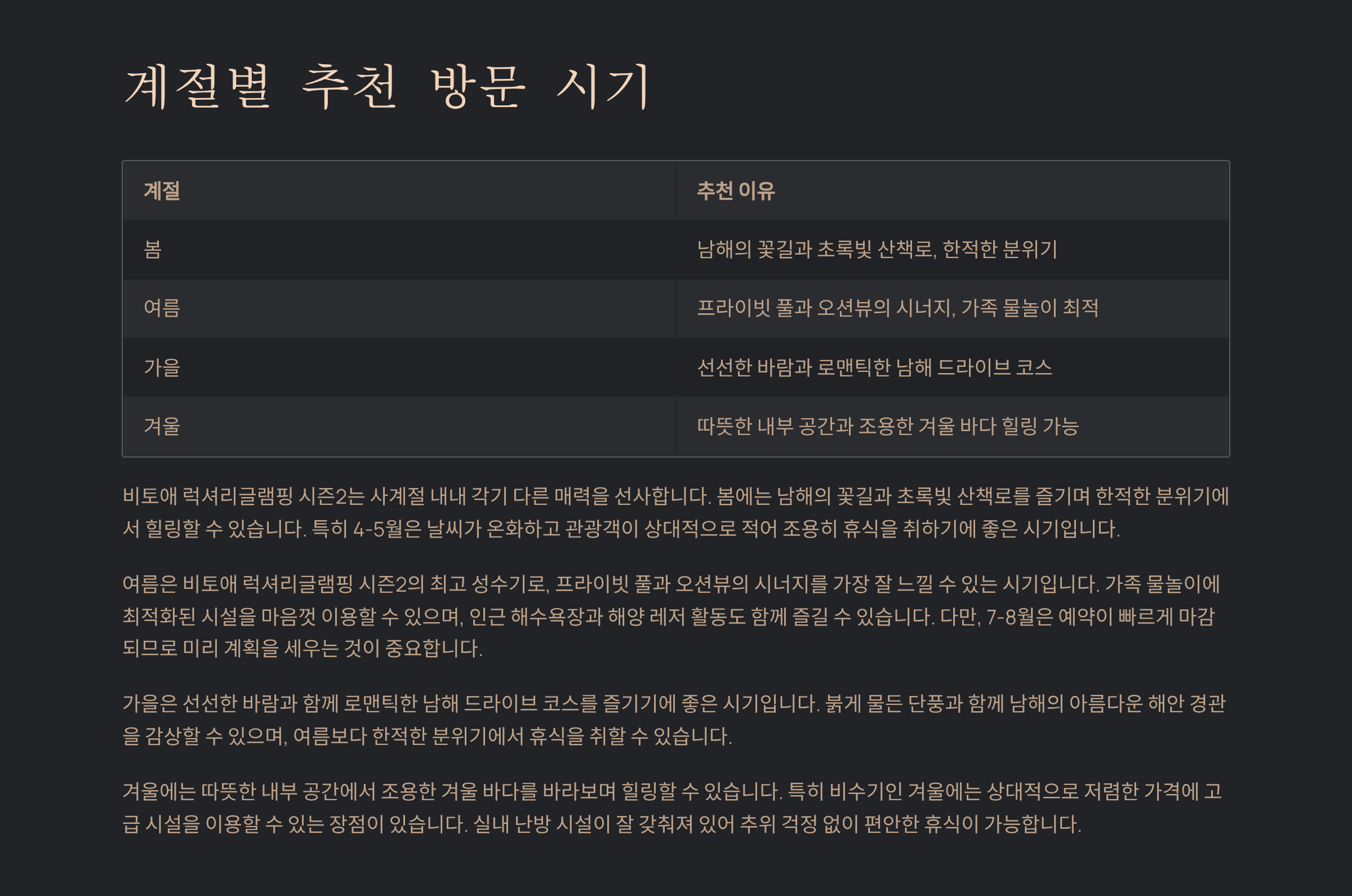 남해의 푸른 바다와 최고급 인테리어가 조화를 이루는 곳. 비토애 럭셔리글램핑 시즌2는 프라이빗한 오션뷰와 호텔급 시설로 연인과 가족 모두에게 사랑받는 글램핑장입니다. 이번 글에서는 위치, 최신 비용대, 객실 정보, 인근 맛집·관광지, 예약 팁, 그리고 실제 방문객 후기를 꼼꼼히 담았습니다.