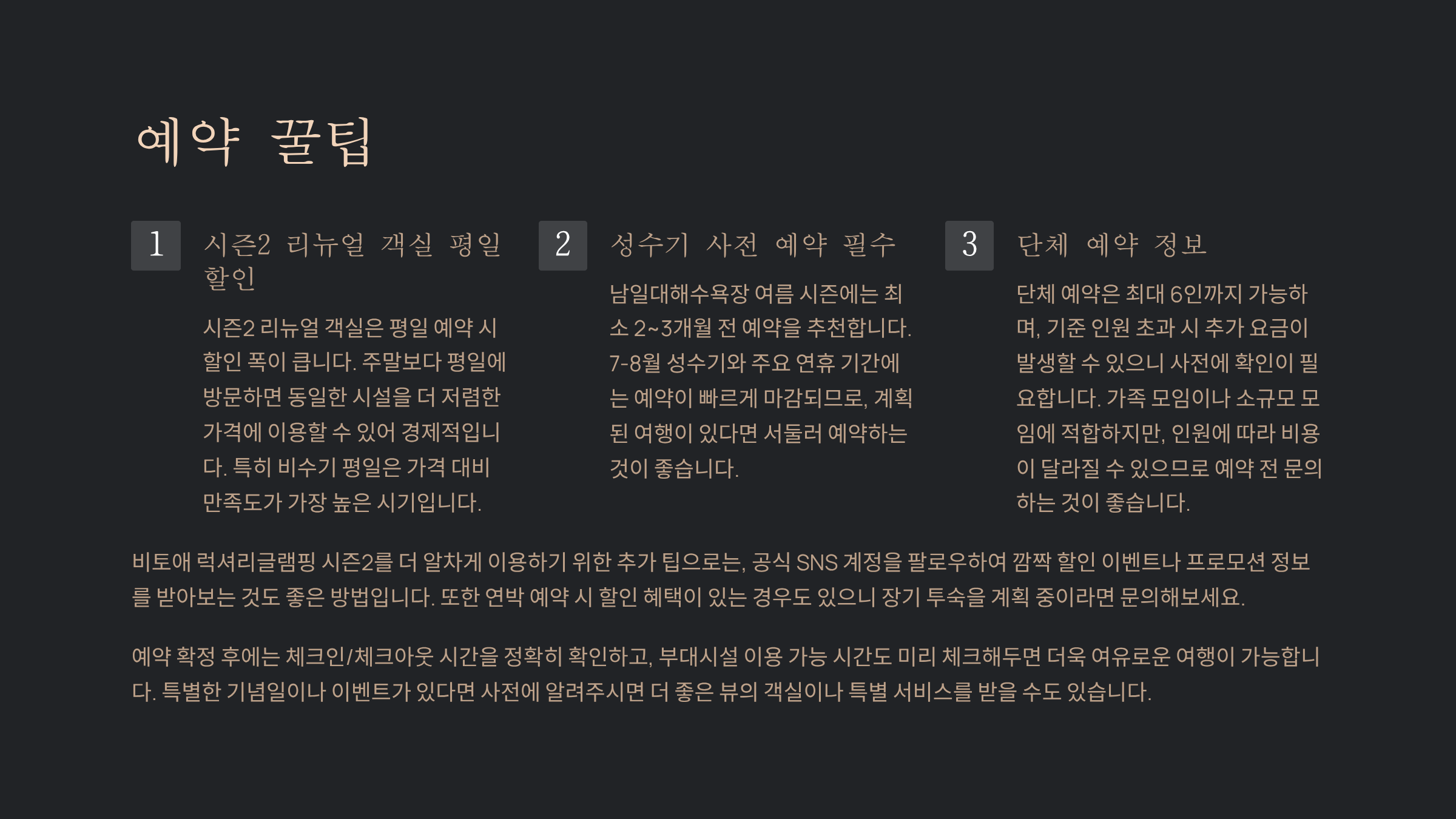 - 시즌2 리뉴얼 객실은 평일 예약 시 할인 폭 큼