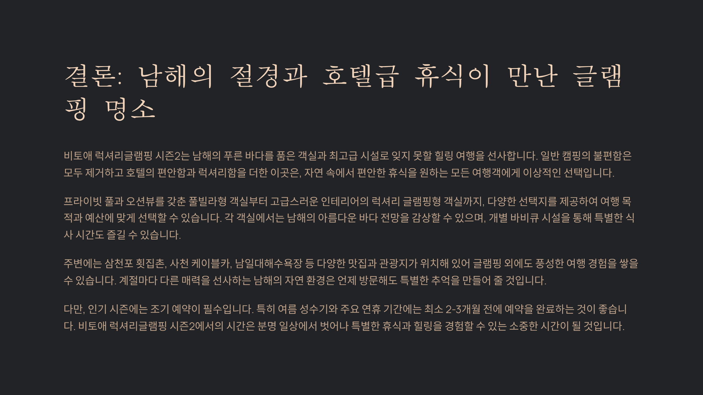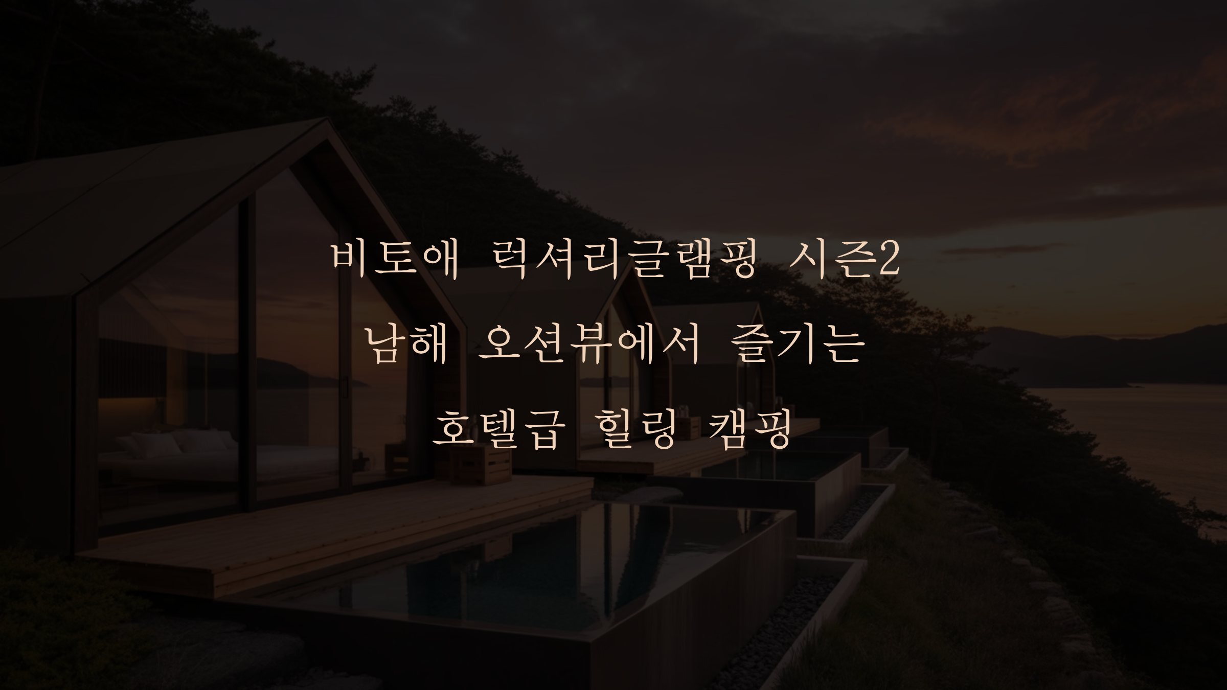 비토애 럭셔리글램핑 시즌2는 남해의 푸른 바다를 품은 객실과 최고급 시설로 잊지 못할 힐링 여행을 선사합니다. 인기 시즌에는 조기 예약이 필수입니다.