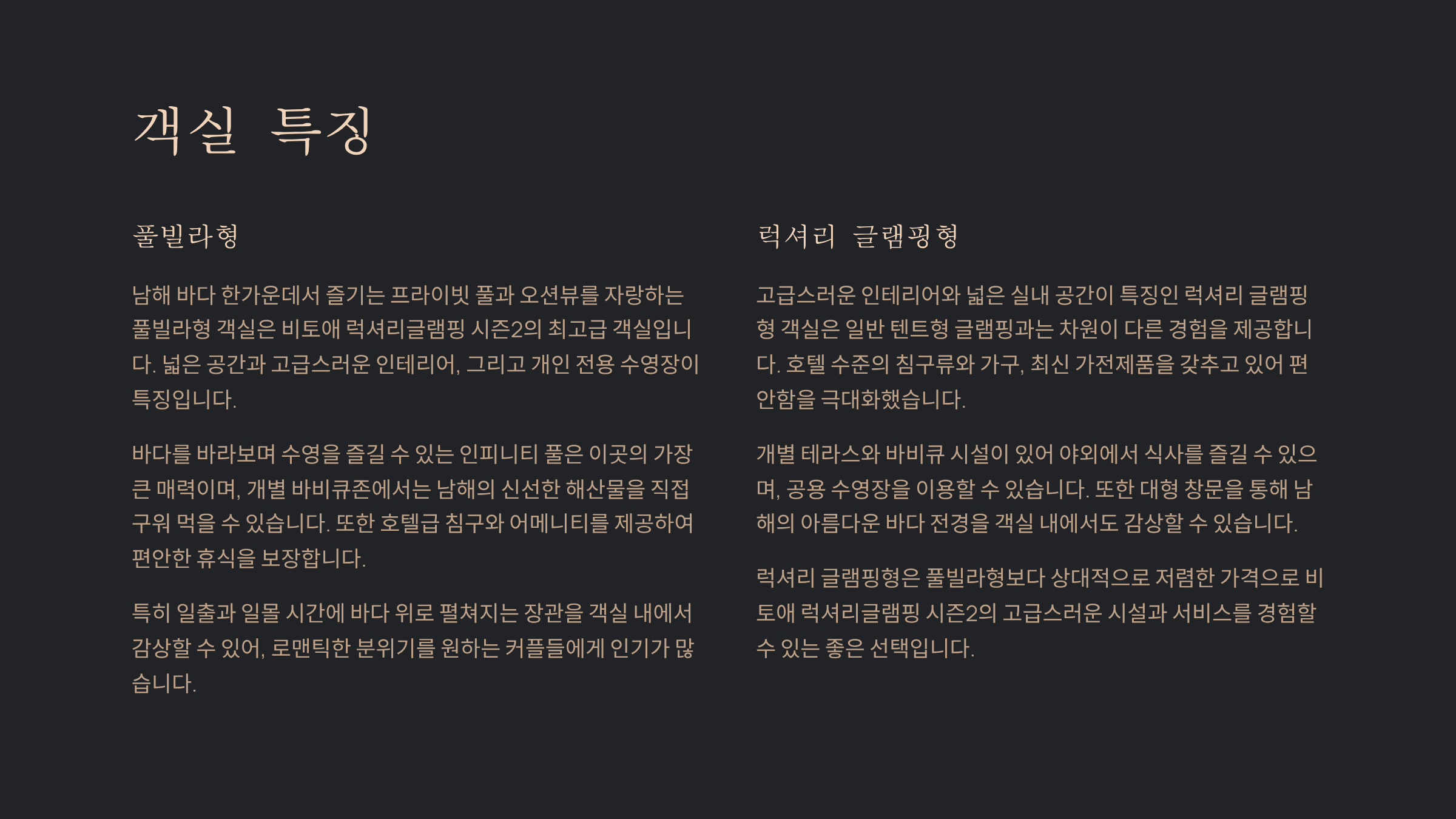 | 객실 유형 | 풀빌라형, 럭셔리 글램핑형 |
