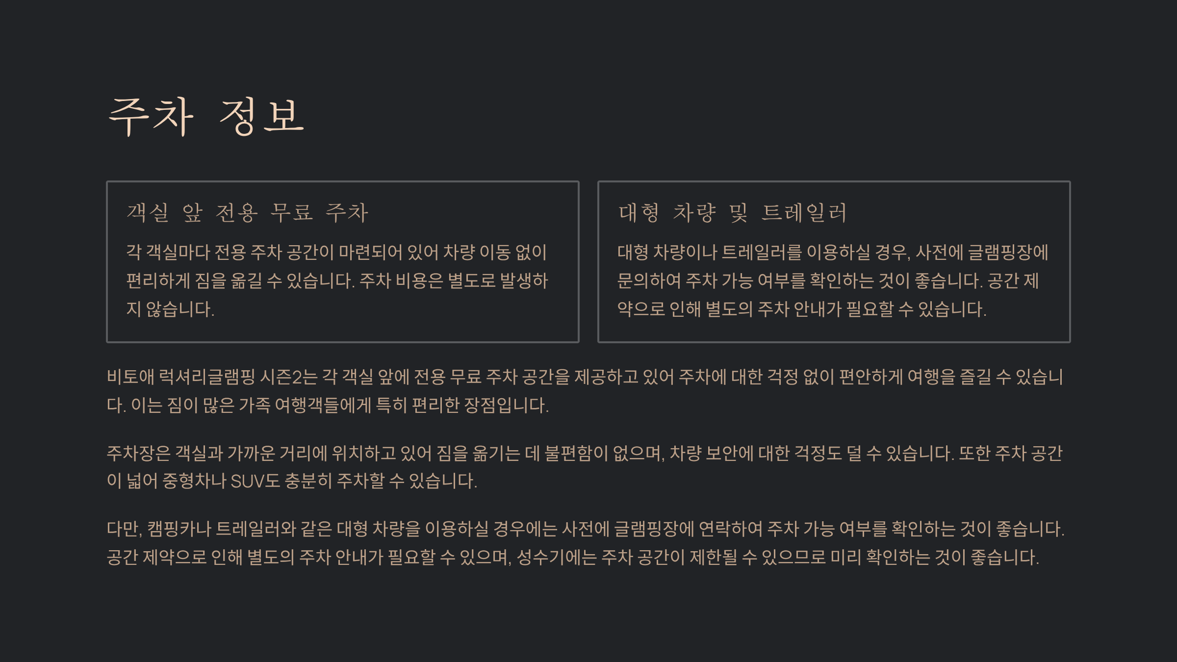 | 주차 | 객실당 전용 무료 주차, 대형 차량 사전 문의 필요 |