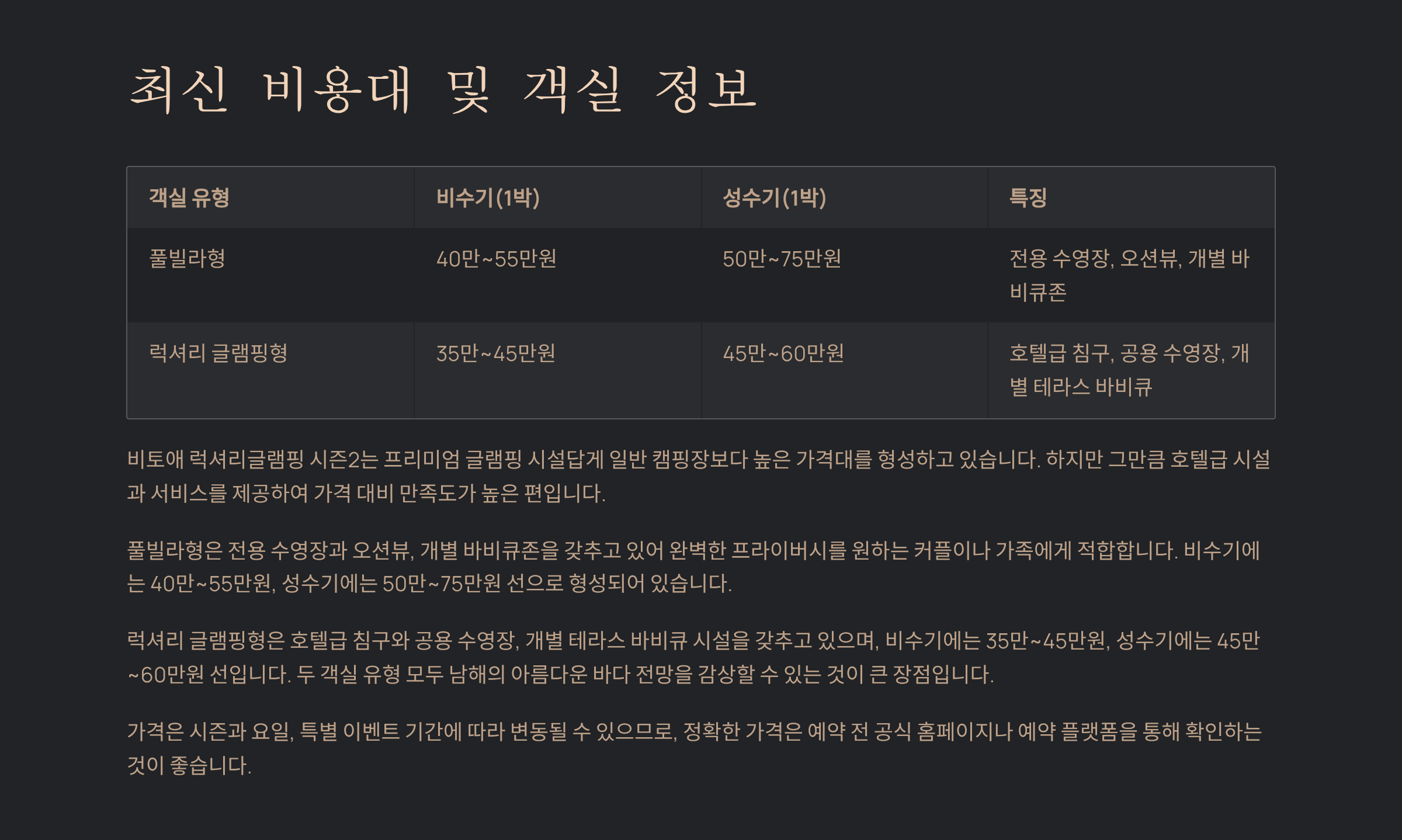 | 풀빌라형 | 40만~55만원 | 50만~75만원 | 전용 수영장, 오션뷰, 개별 바비큐존 |