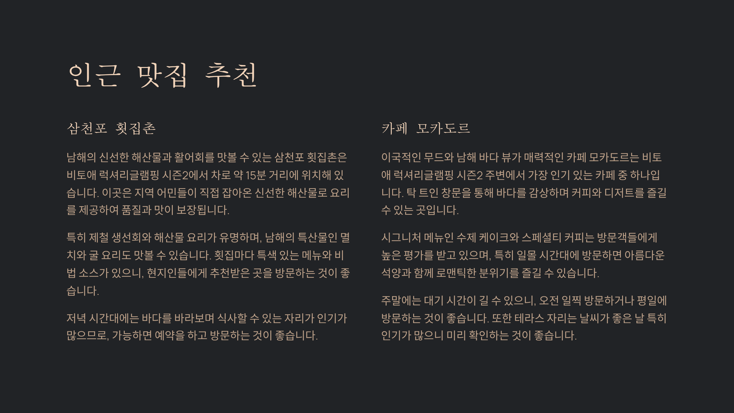 - “연인과 남해 바다를 바라보며 프라이빗하게 힐링하기 딱 좋았어요.”