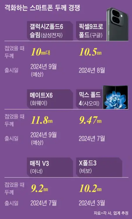 삼성전자가 슬림폰 시장에 적극적으로 뛰어든 이유 중 하나는 빠르게 성장하고 있는 중국 스마트폰 브랜드들 때문입니다. 화웨이, 아너, 샤오미 등 중국 브랜드들은 이미 9㎜대의 초박형 폴더블폰을 선보이며 시장에서 큰 반향을 일으키고 있습니다. 이에 대응하기 위해 삼성은 갤럭시Z폴드6 슬림을 중국 시장에 '심계천하 W25'라는 이름으로 출시할 계획입니다.