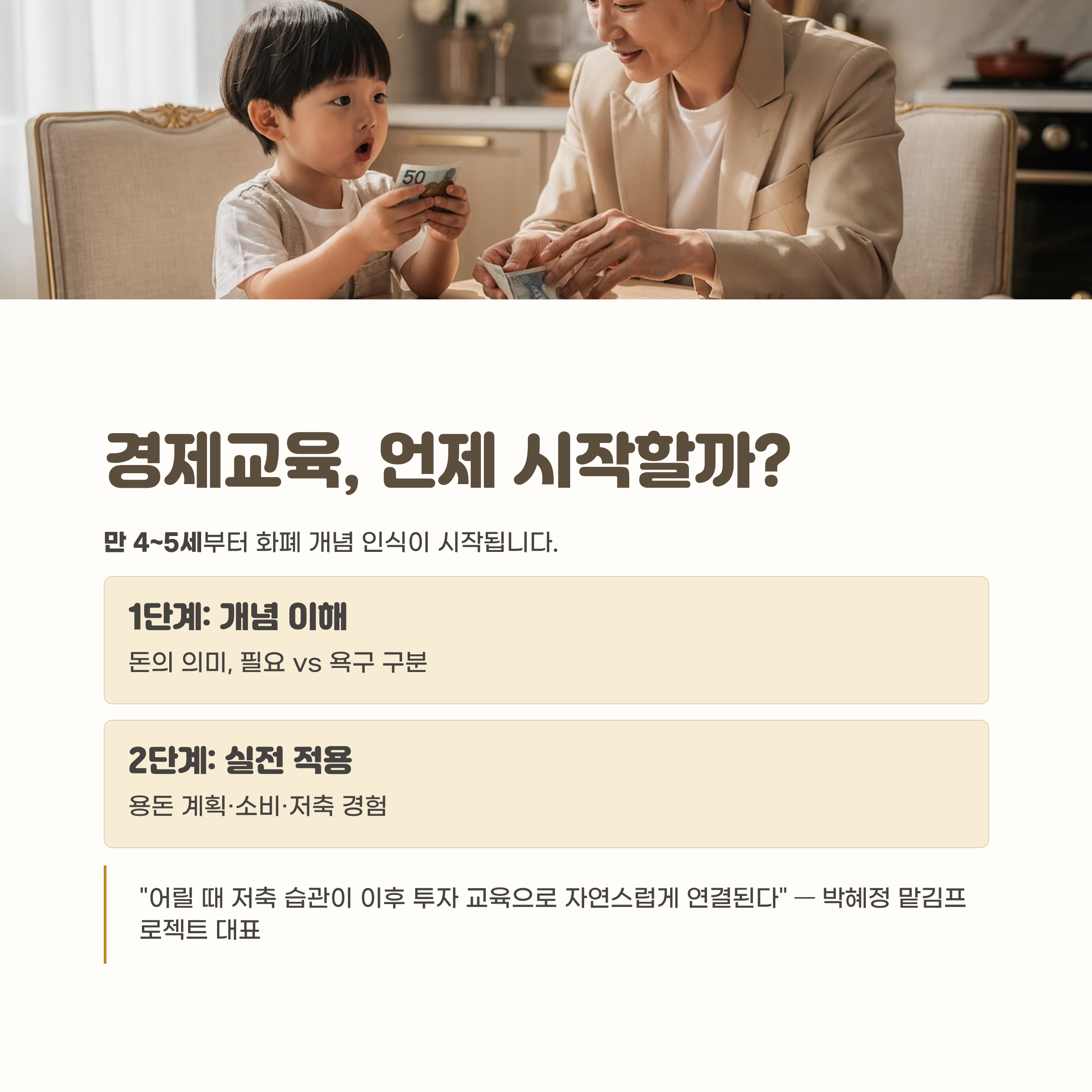 재테크 전문가 박혜정 맡김프로젝트 대표는 "어릴 때 저축 습관을 가지도록 도와주면, 소비 조절과 목표를 이루는 작은 성공 경험이 쌓이면서 이후 금융상품이나 투자 같은 심화 교육으로도 자연스럽게 연결된다"고 강조합니다.
