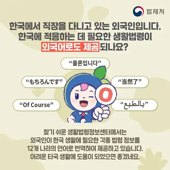 • 외국인을 위한 맞춤형 법령: 한국에서 거주하는 외국인들이 생활에 필요한 법령 정보를 12개 언어로 번역해 제공합니다.
