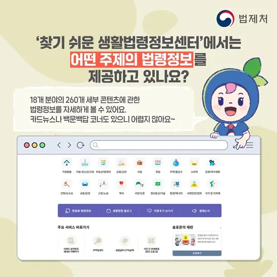 • 생활법령정보센터: 생활에 필요한 법령 정보를 주제별로 정리하여 제공. 사용자가 쉽게 접근하고 이해할 수 있도록 카드뉴스와 백문백답 형식으로 법령을 풀어 설명합니다.