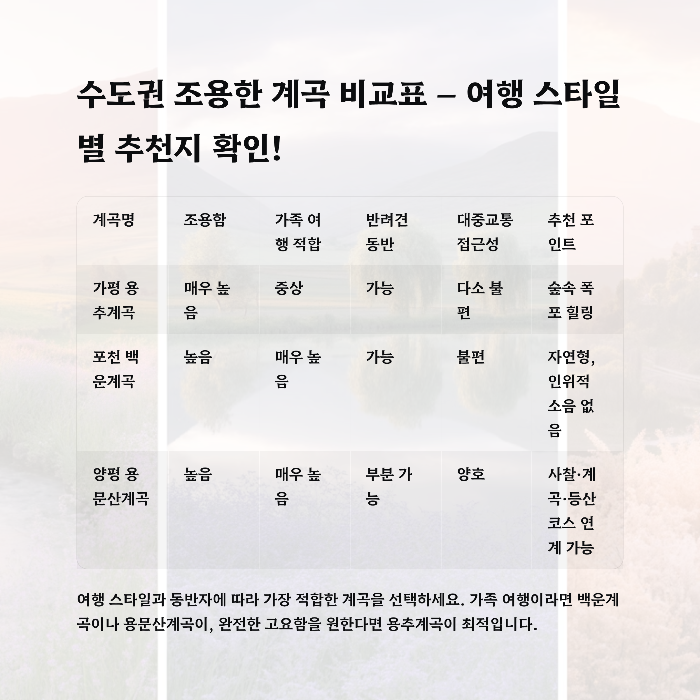 수도권 조용한 계곡 비교표 – 여행 스타일별 추천지 확인!