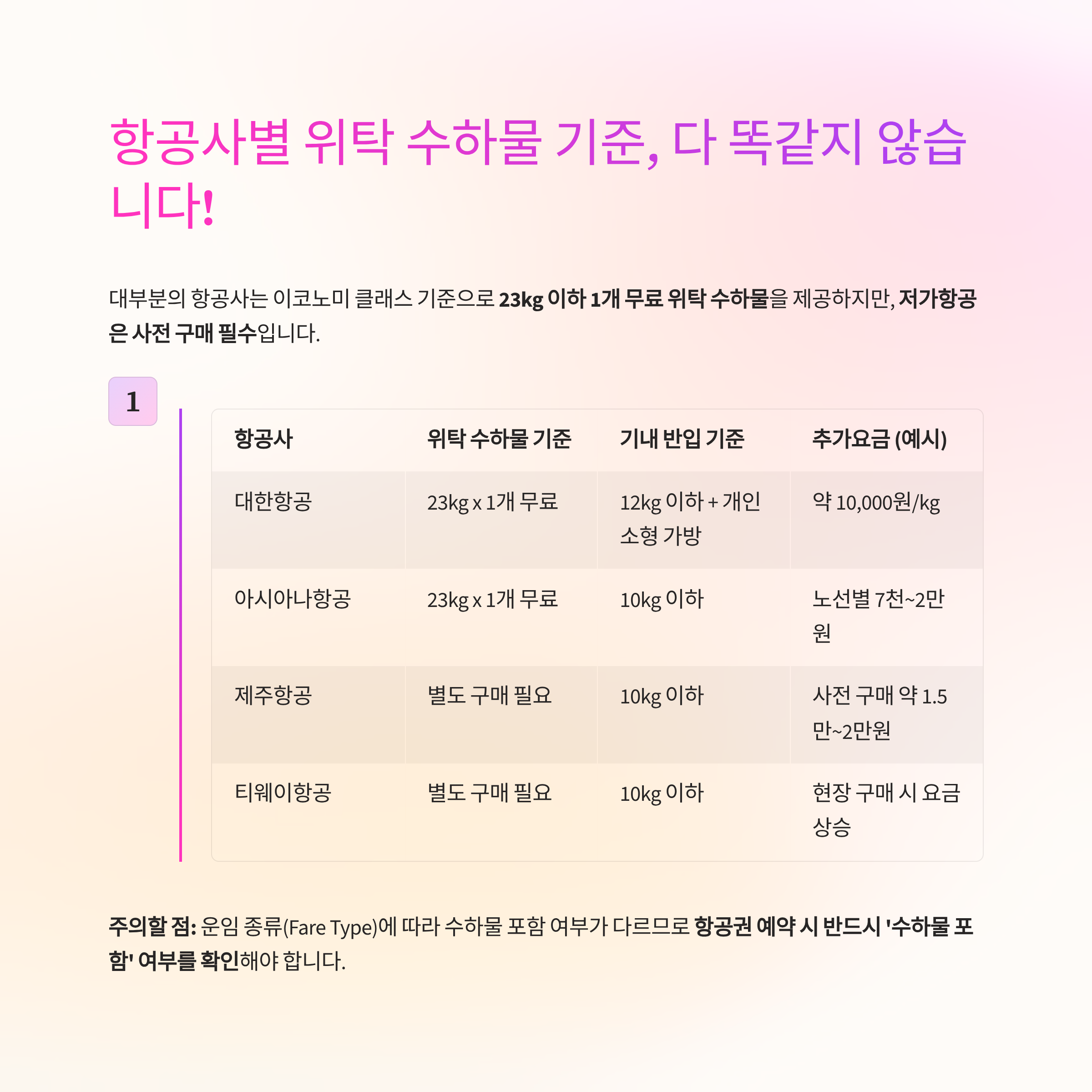 - **운임 종류(Fare Type)**에 따라 수하물 포함 여부가 다르므로