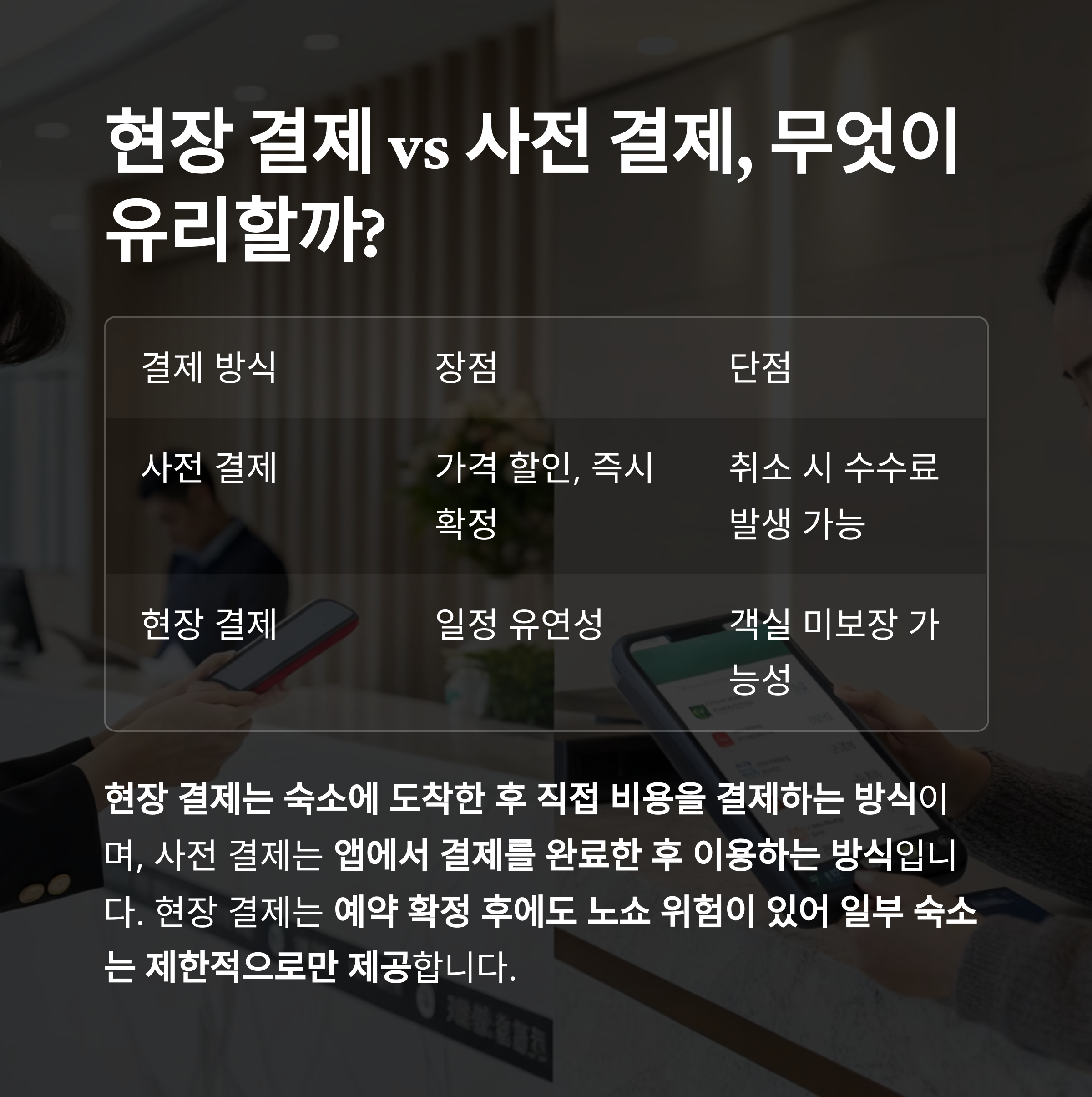 | 현장 결제 | 일정 유연성 | 객실 미보장 가능성 |