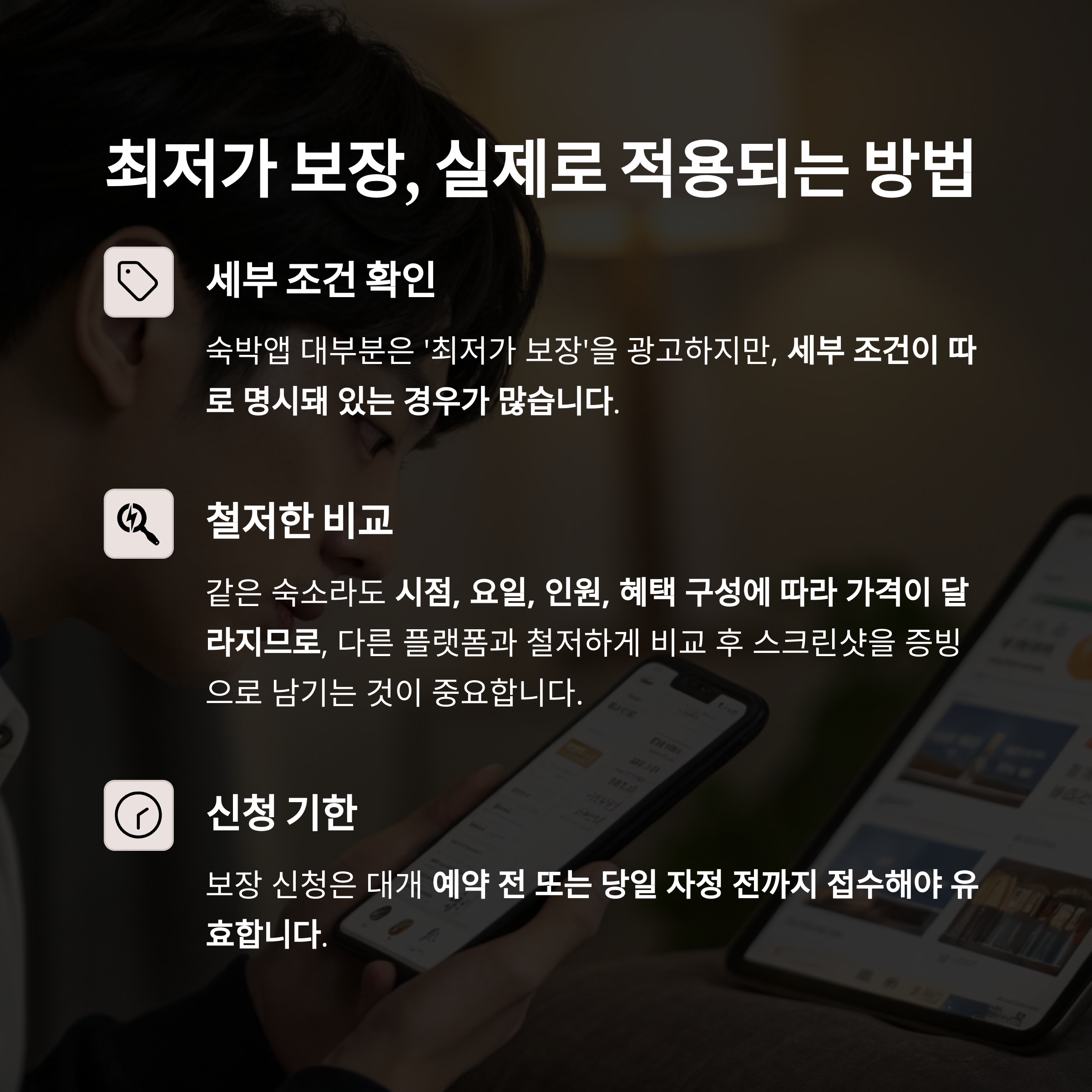 숙박앱 대부분은 ‘최저가 보장’을 광고하지만, 세부 조건이 따로 명시돼 있는 경우가 많습니다.