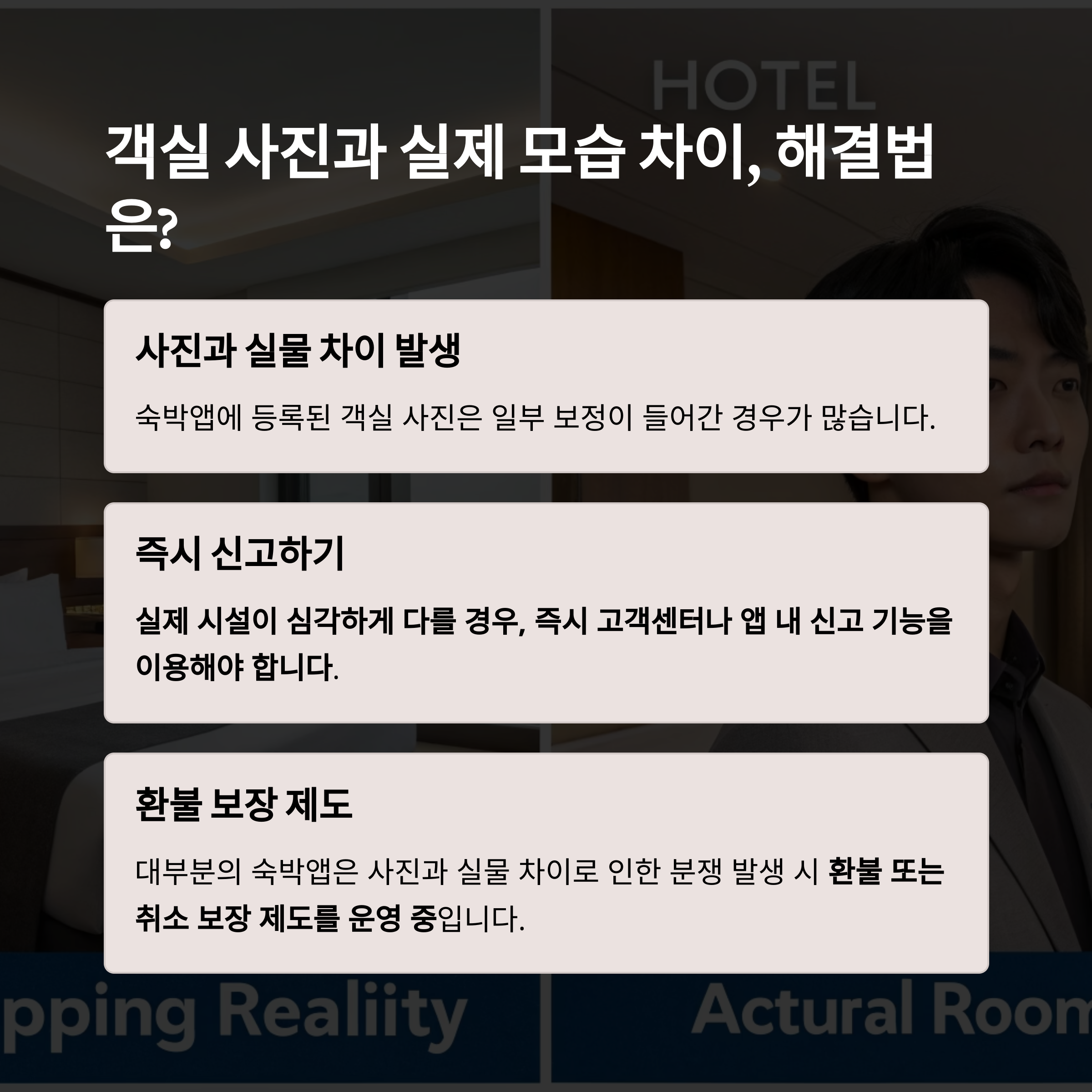 대부분의 숙박앱은 사진과 실물 차이로 인한 분쟁 발생 시 환불 또는 취소 보장 제도를 운영 중입니다.