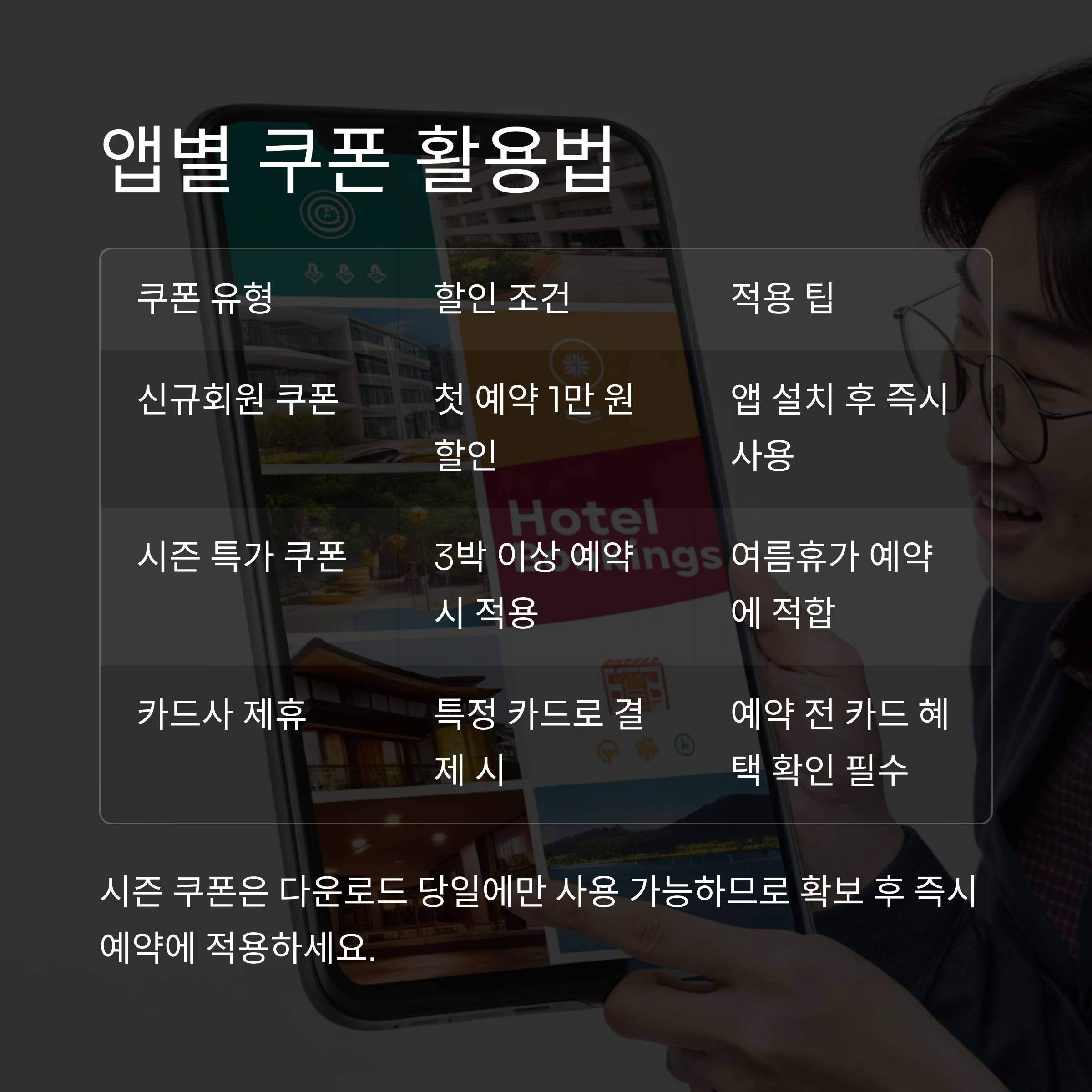 | 시즌 특가 쿠폰 | 3박 이상 예약 시 적용 | 여름휴가 예약에 적합 |