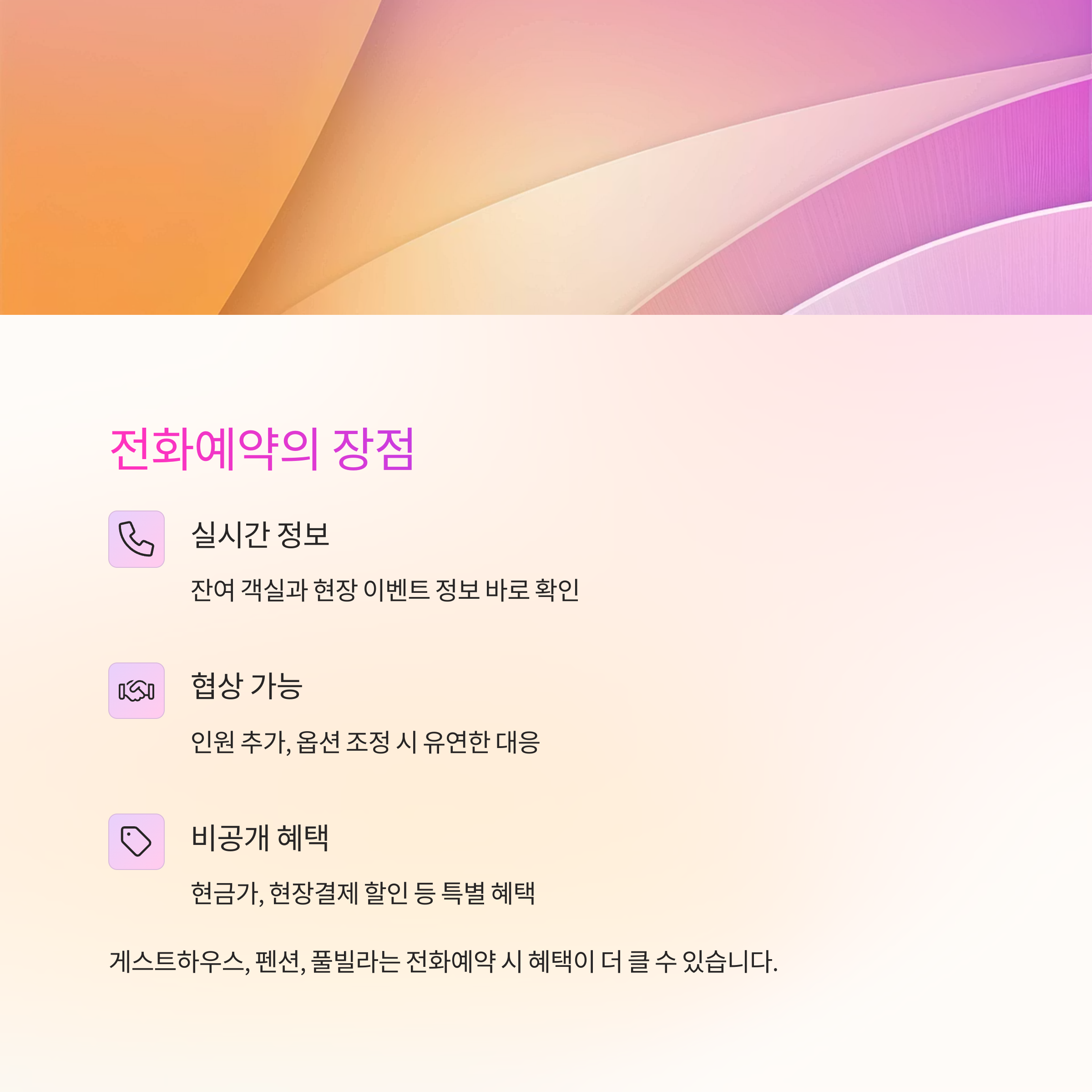 현장에서 운영되는 게스트하우스, 펜션, 풀빌라 등은 전화예약 시 혜택이 더 클 수 있습니다.