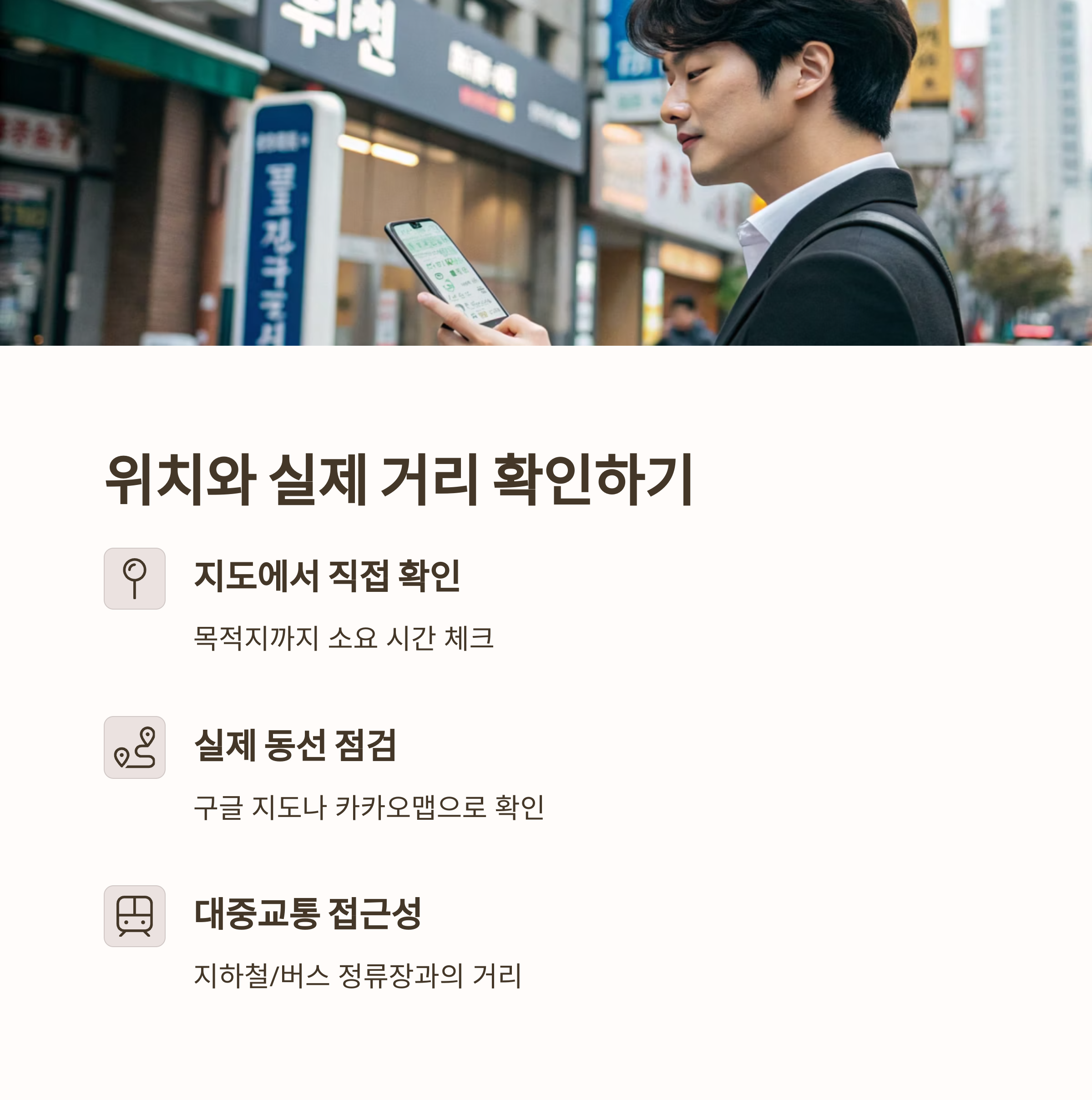 지도에서 숙소 위치를 직접 확인하고, 목적지까지 소요 시간도 체크해야 합니다.