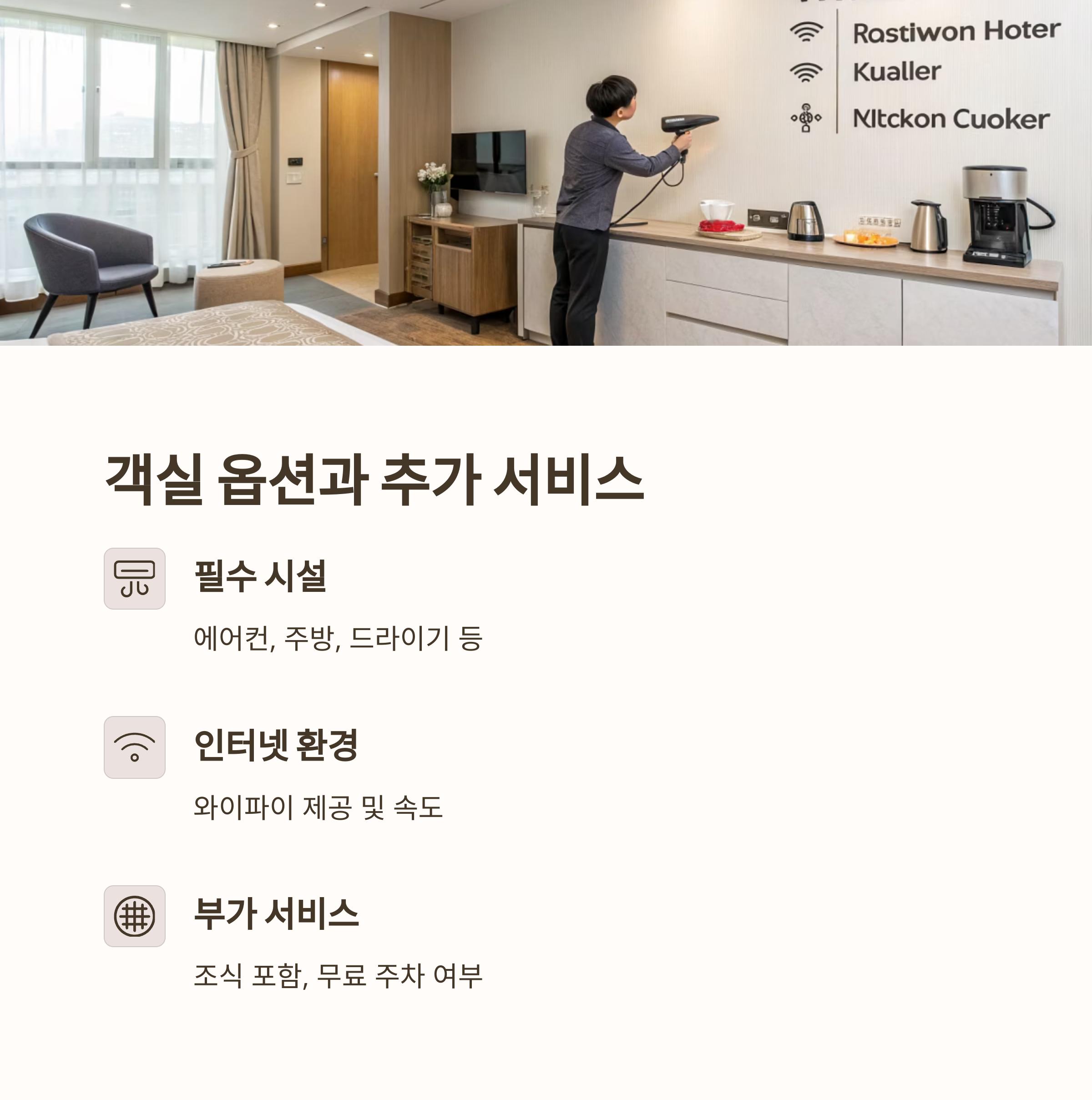 예약 전에 객실 옵션표를 반드시 확인하고, 조식 포함 여부, 무료 주차 가능 여부, 와이파이 제공도 체크해야