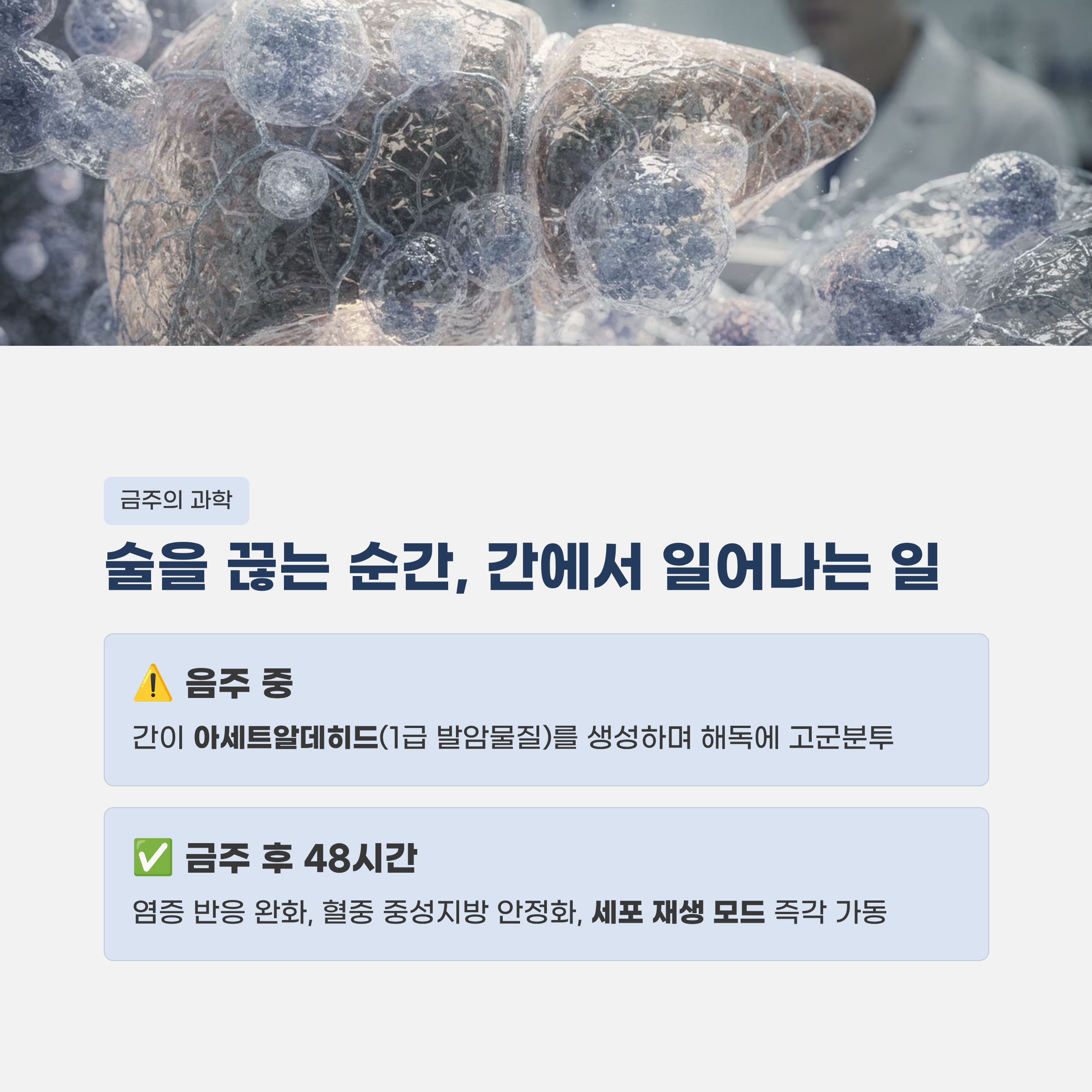 우리가 술을 마시면 간은 알코올을 해독하기 위해 '아세트알데히드'라는 1급 발암물질을 생성하며 고군분투합니다. 금주를 시작하면 간은 비로소 해독 업무에서 벗어나 '세포 수리 및 재생' 모드로 전환됩니다.