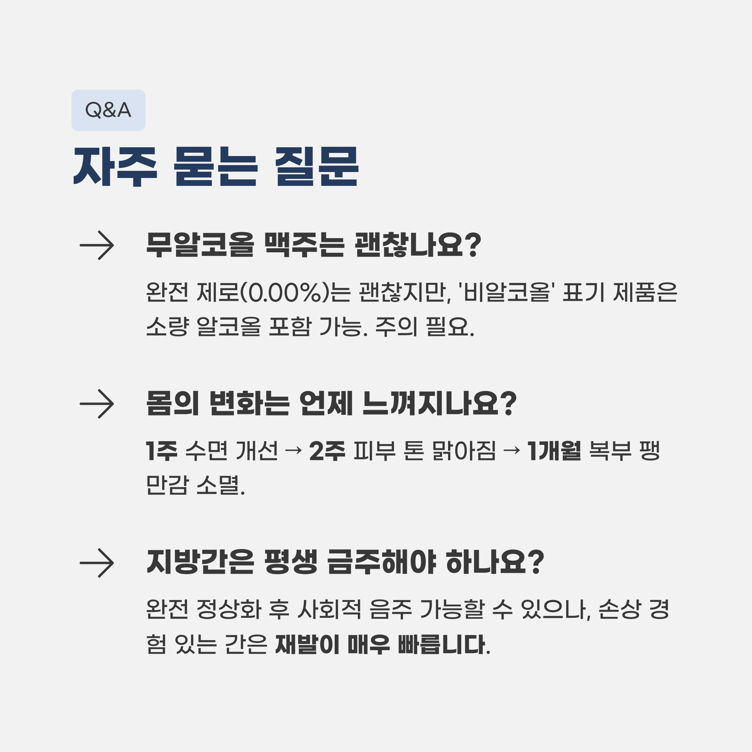 - "수치가 좋아졌으니 다시 마셔도 되겠지": 간은 회복된 직후가 가장 약합니다. 이때 마시는 술은 이전보다 더 깊은 손상을 입힙니다.