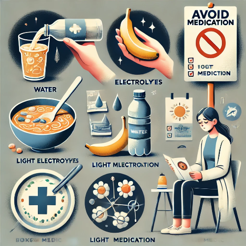 설사와 구토로 인해 체내 수분과 전해질이 급격히 손실되기 때문에 수분 보충이 가장 중요합니다. 물, 전해질 음료, 또는 이온음료를 섭취하여 체내 균형을 유지해야 합니다. 특히 소금과 설탕을 적절히 섞은 물을 마시면 전해질 균형을 유지하는 데 효과적입니다.