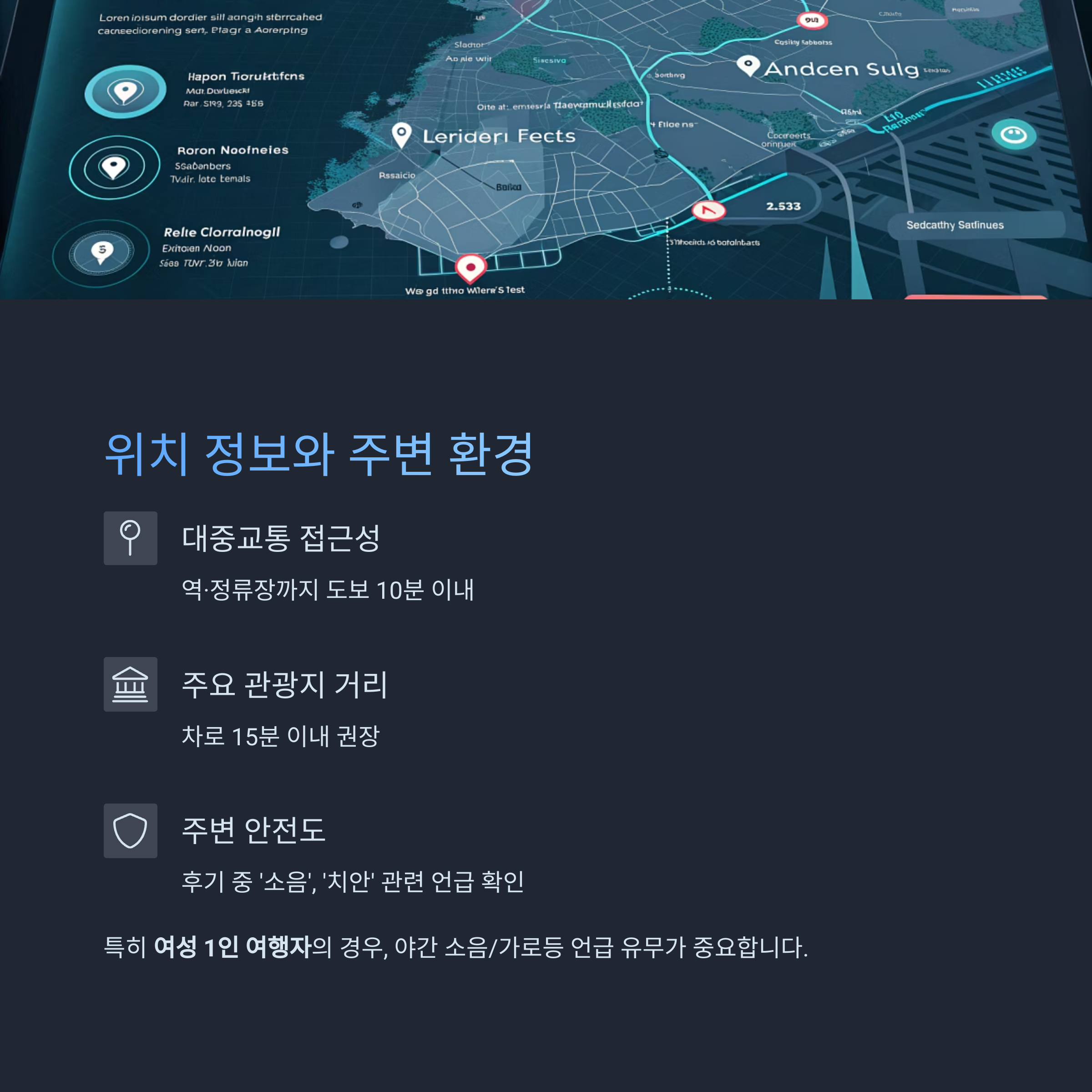 특히 여성 1인 여행자의 경우, "후기에서 야간 소음/가로등 언급" 유무가 중요합니다.