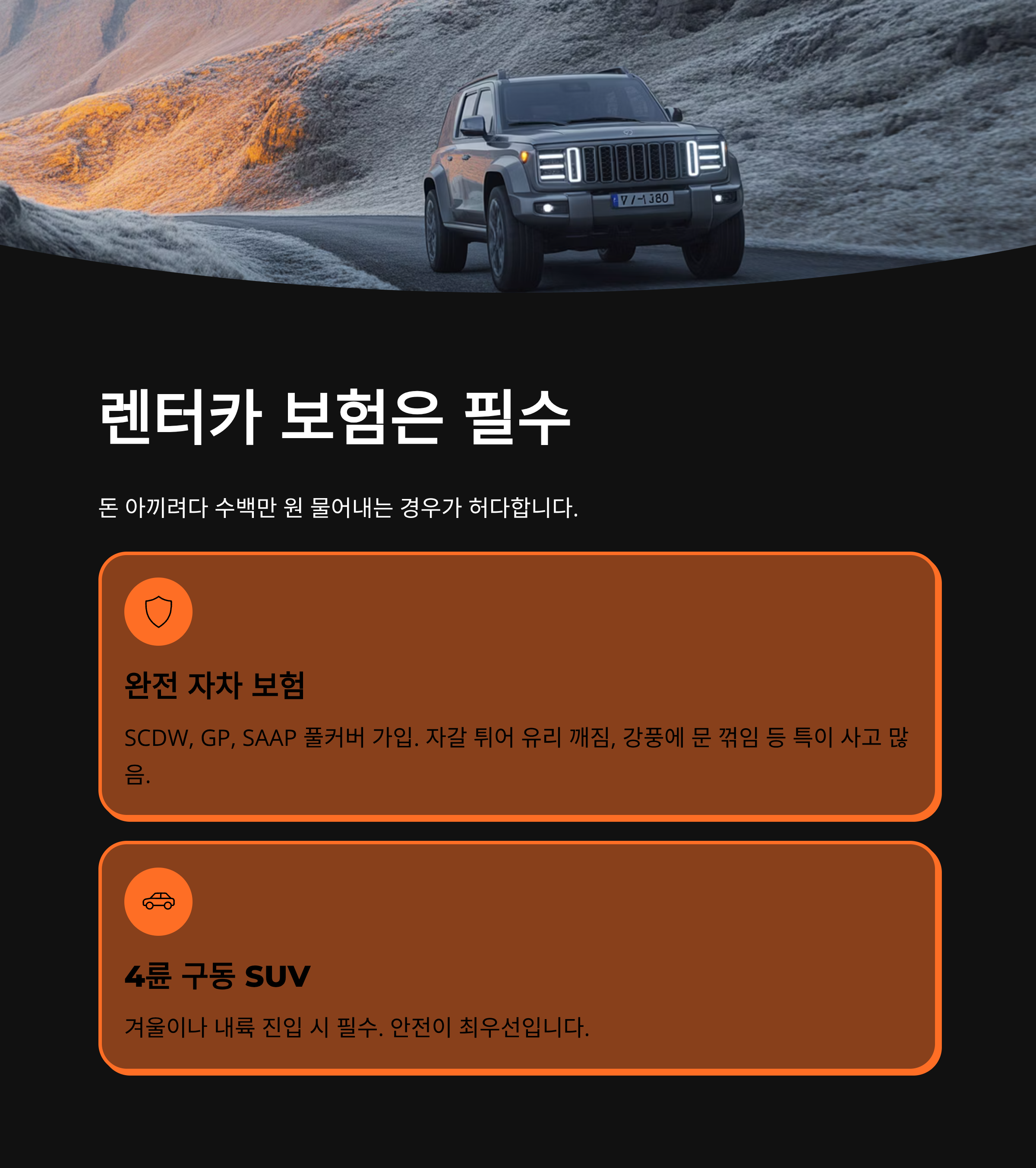 • 4륜 구동 (4WD): 링로드(1번 국도)만 돈다면 여름엔 2륜도 가능하지만, 겨울이거나 조금이라도 내륙으로 들어간다면 4륜 구동 SUV가 안전합니다.