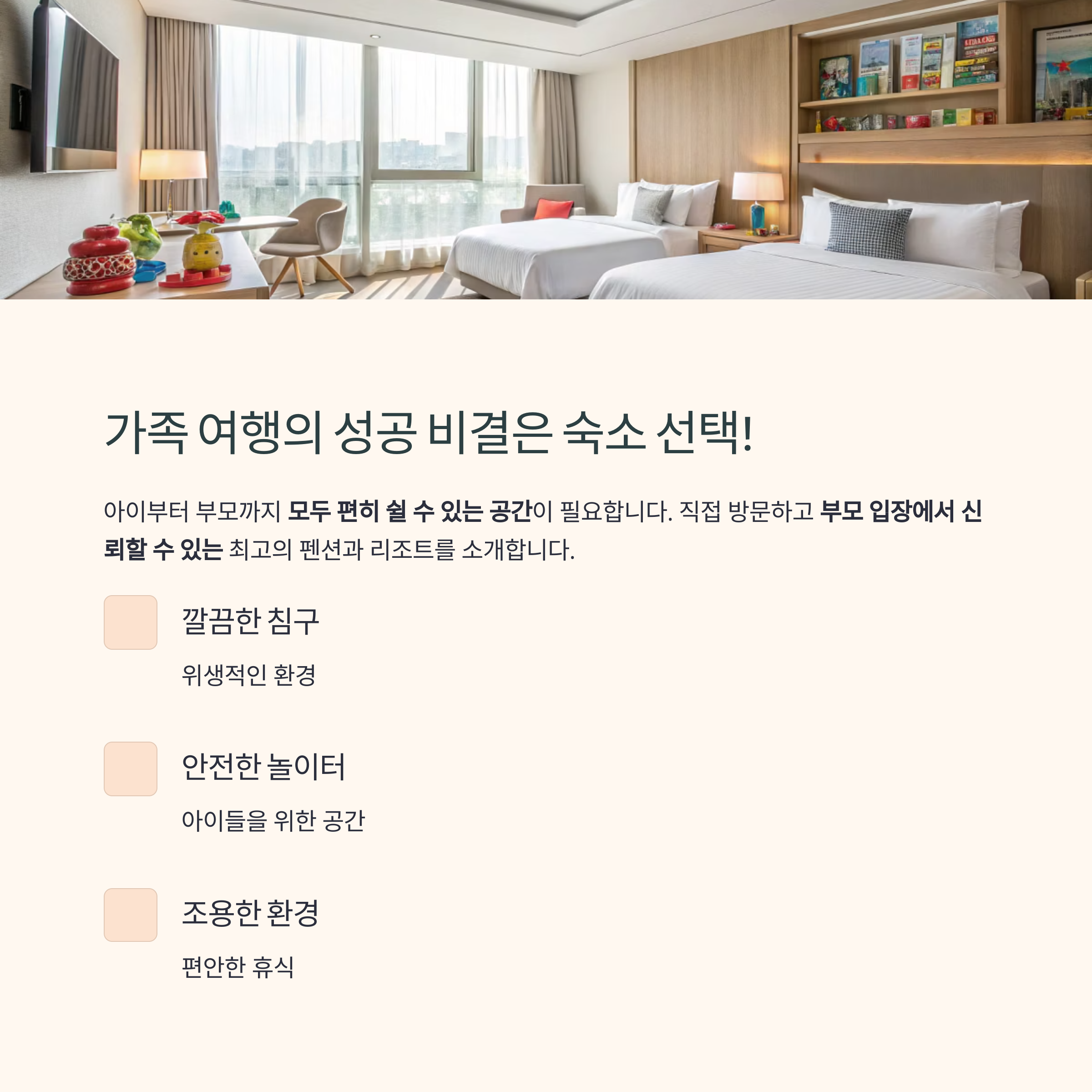 깔끔한 침구, 안전한 놀이터, 조용한 환경, 그리고 무엇보다 아이부터 부모까지 모두 편히 쉴 수 있는 공간이 필요하죠.