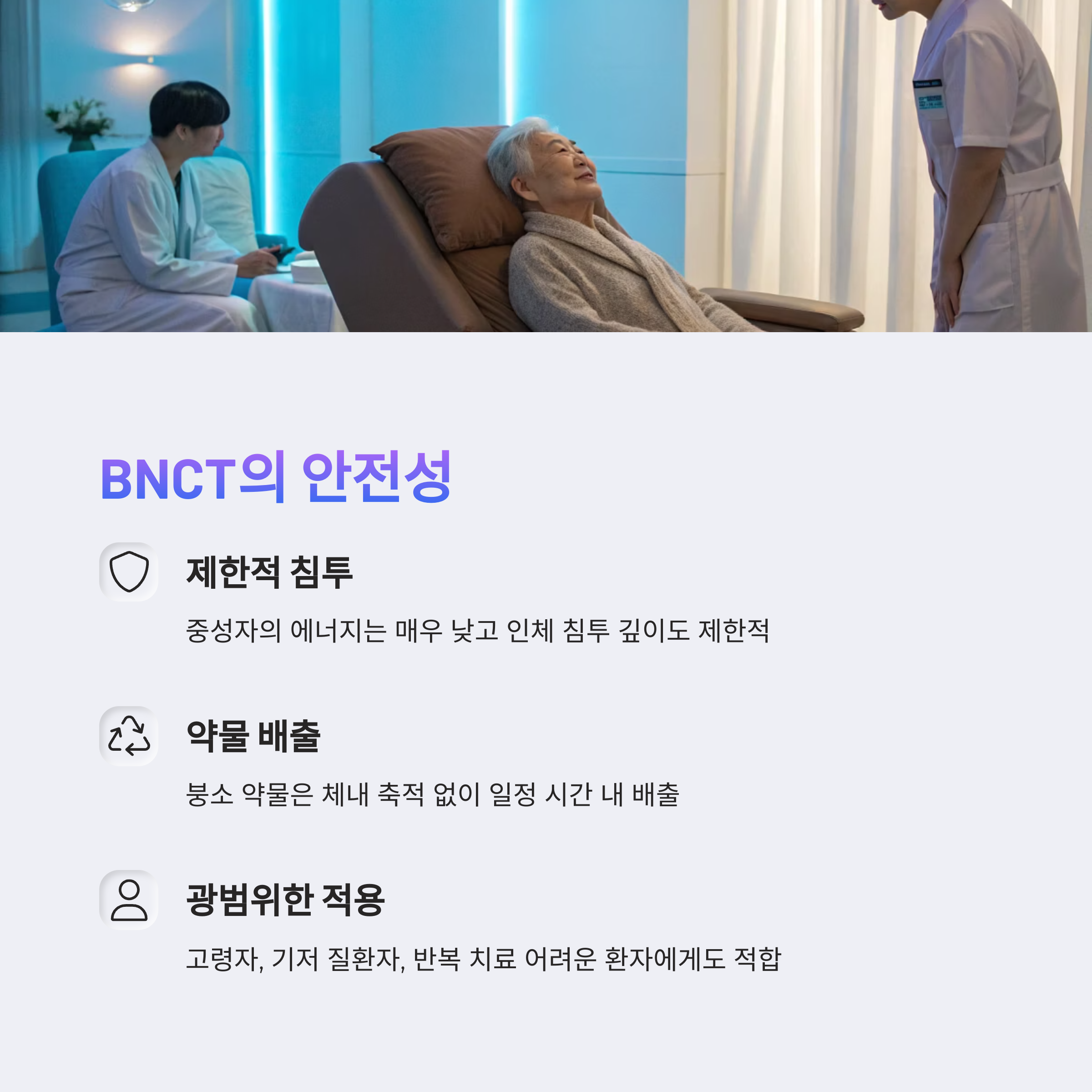 이로 인해 BNCT는 고령자, 기저 질환자, 반복 치료가 어려운 환자에게도 안전하게 적용될 수 있습니다.