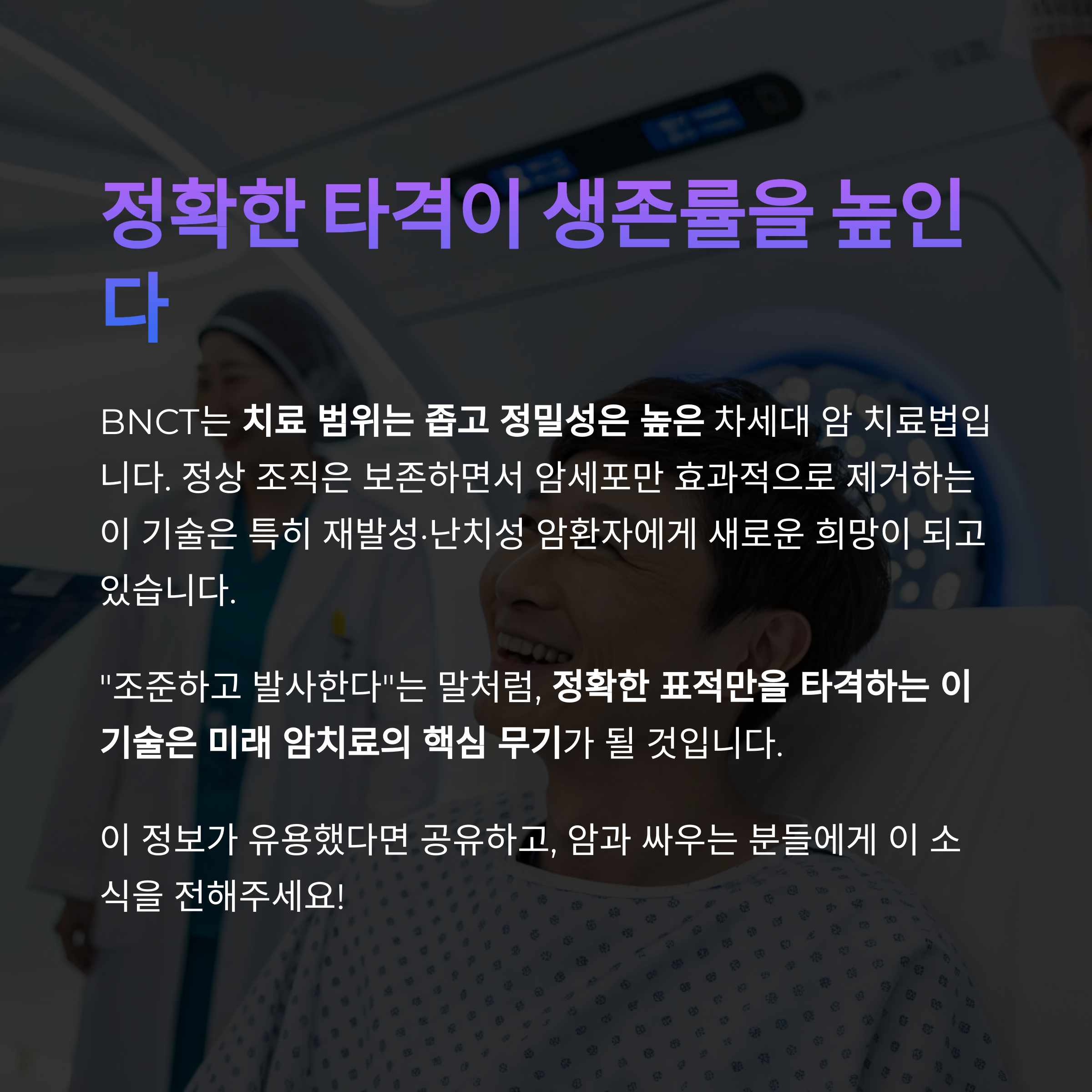 정상 조직을 보존하면서도 암세포를 효과적으로 제거하는 이 기술은, 특히 재발성·난치성 암환자에게 새로운 희망이 되고 있습니다.