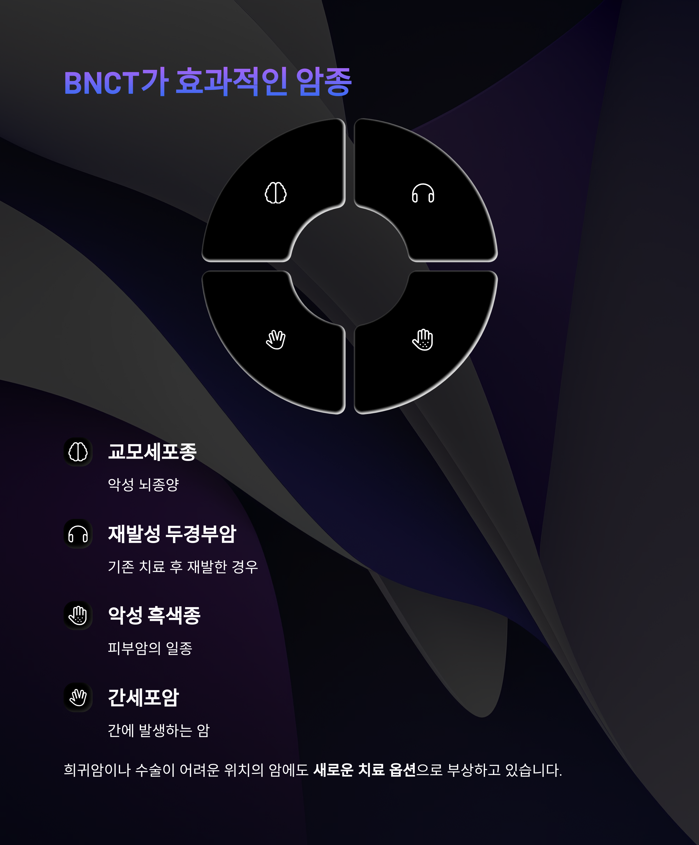 이 외에도 희귀암이나 수술이 어려운 위치에 발생한 암에 대해서도 BNCT가 치료 옵션으로 부상하고 있습니다.