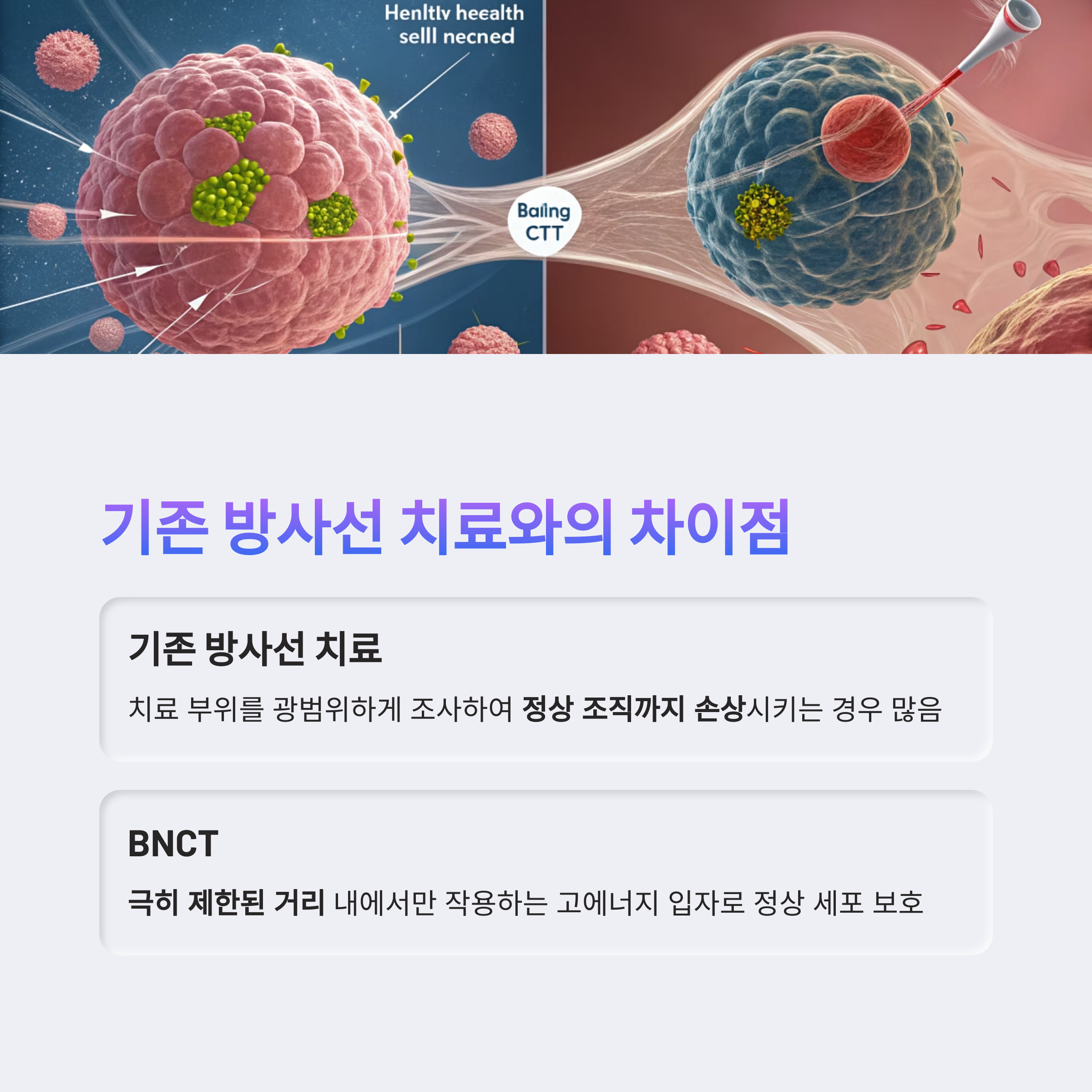 반면 BNCT는 암세포에만 붕소가 축적된 후 중성자를 조사하여, 극히 제한된 거리 내에서만 작용하는 고에너지 입자를 발생시키기 때문에, 정상 세포는 거의 손상되지 않습니다.