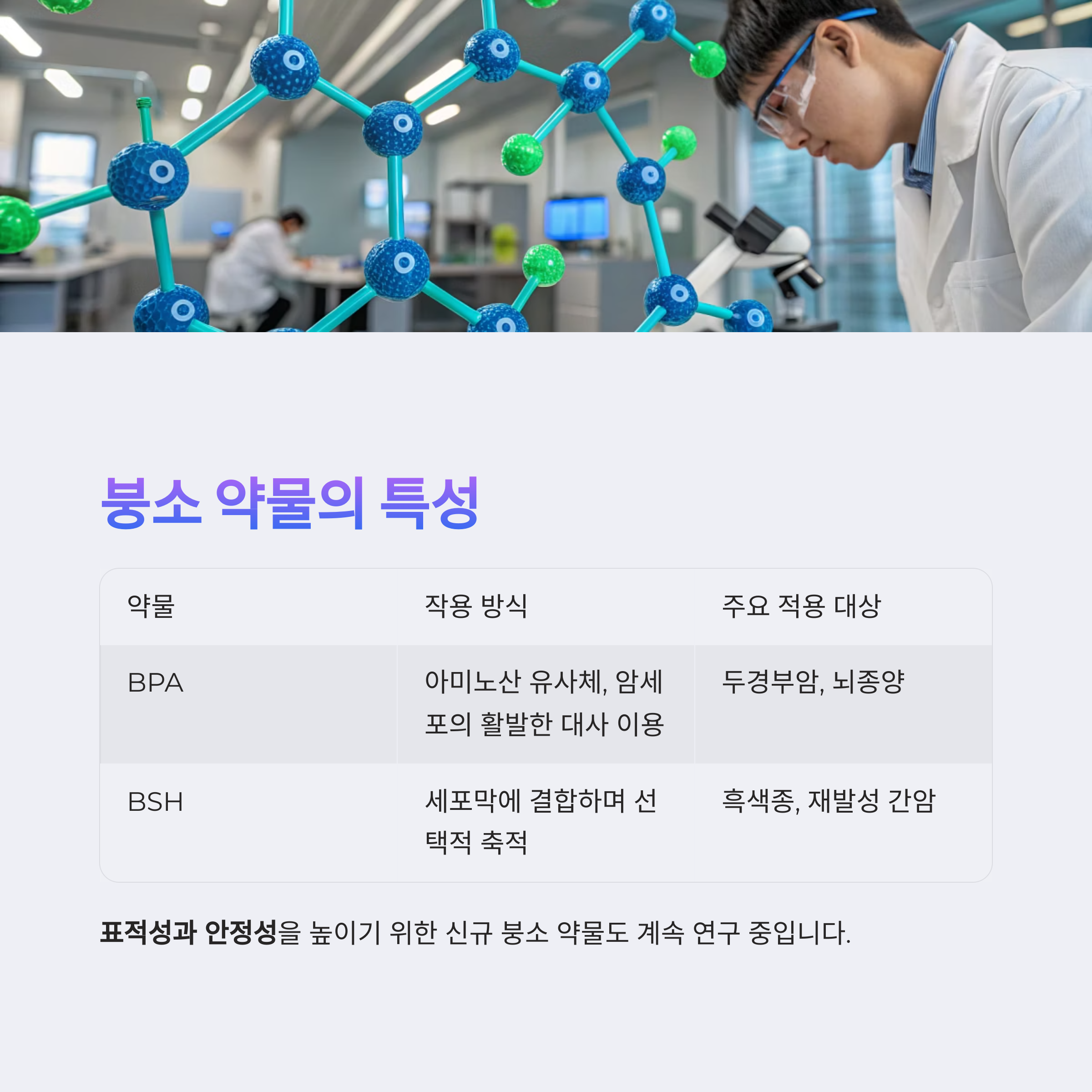 이러한 약물은 표적성과 안정성을 모두 만족시키기 위해 계속 발전 중이며, 신규 붕소 약물 후보도 연구되고 있는 중입니다.