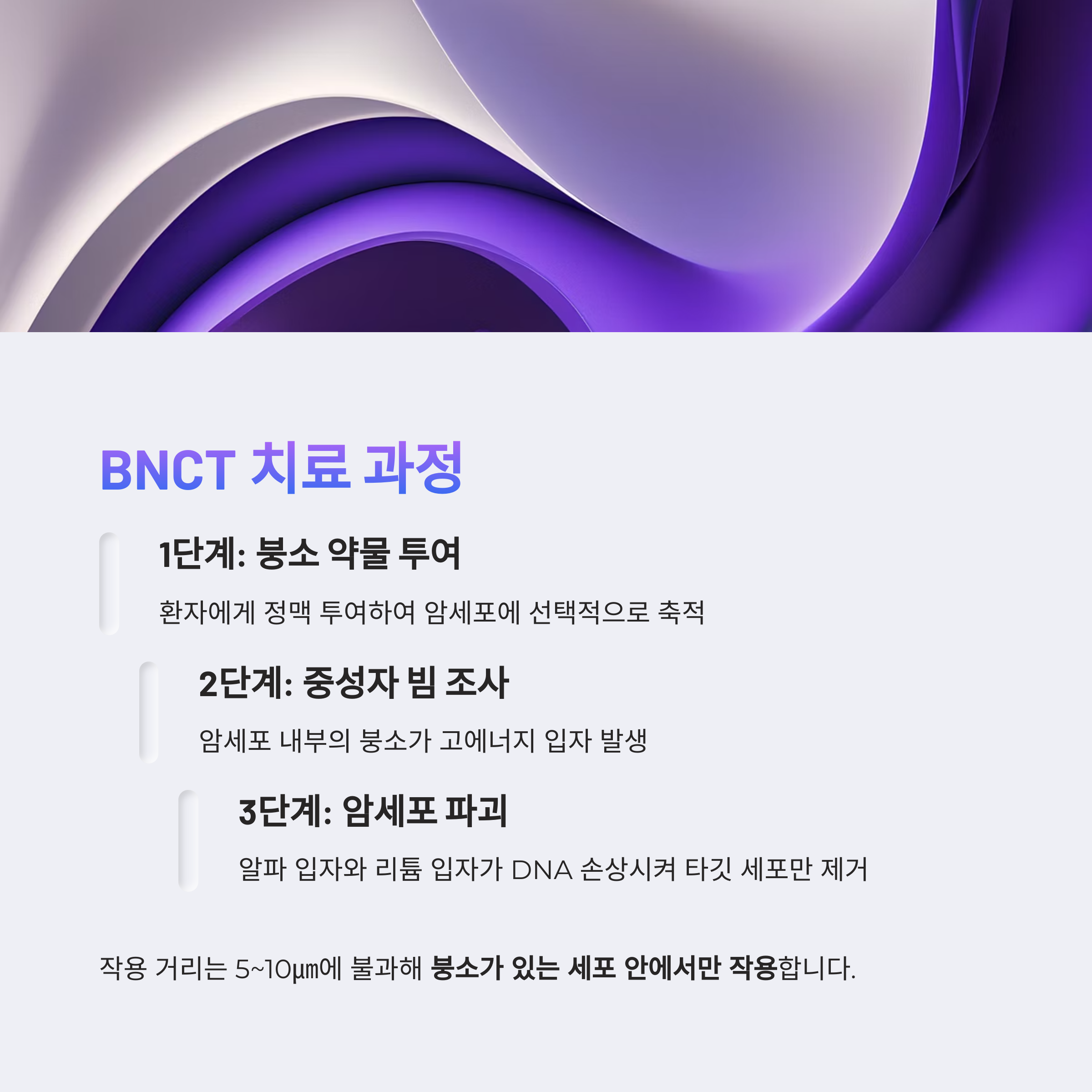 BNCT는 암세포 내부에 축적된 붕소(B-10)가 중성자를 포획하면서 고에너지 입자를 방출, 그로 인해 암세포를 내부에서 파괴하는 치료법입니다.