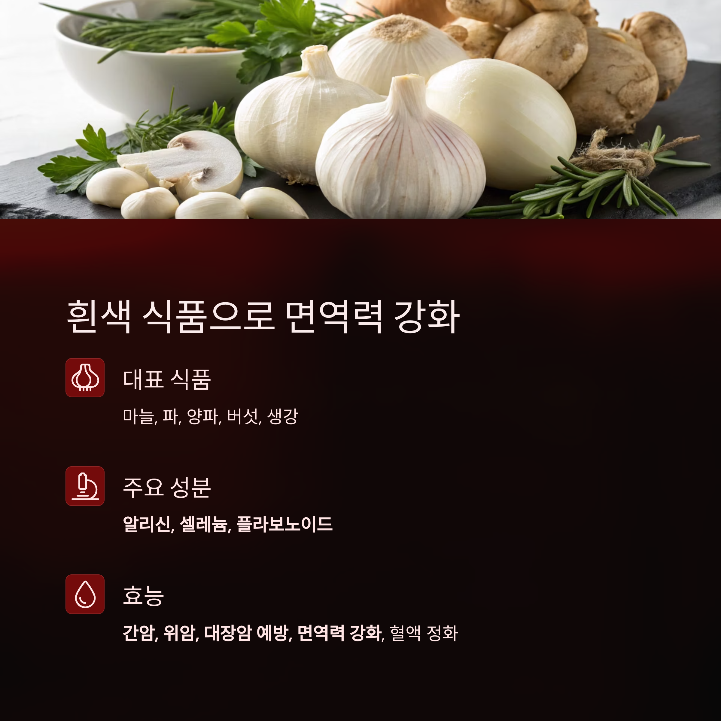 | 흰색 | 마늘, 양파, 버섯 | 면역력 강화, 간암·위암 예방 |