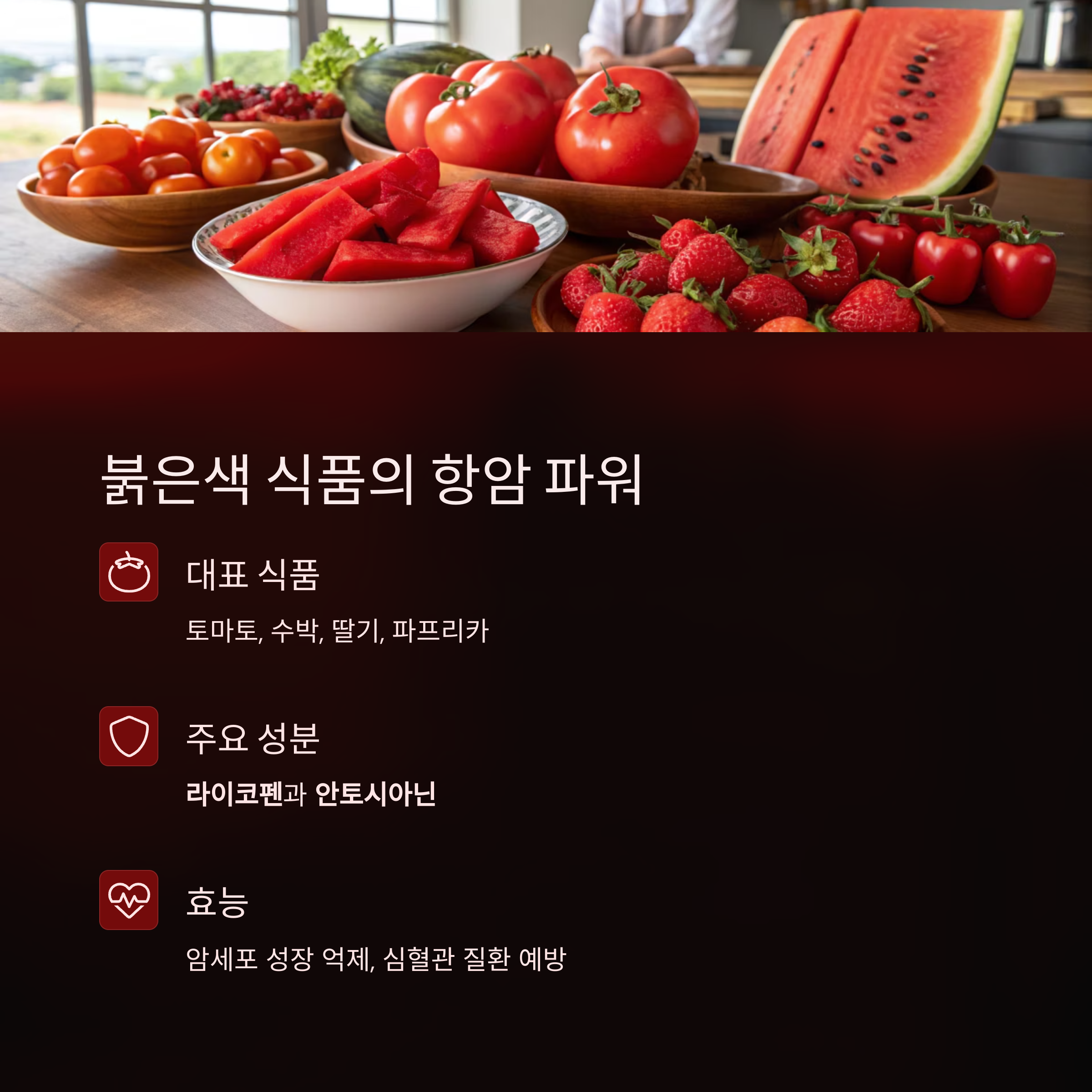 | 붉은색 | 토마토, 수박, 딸기, 파프리카 | 암세포 성장 억제, 심장병 예방 |