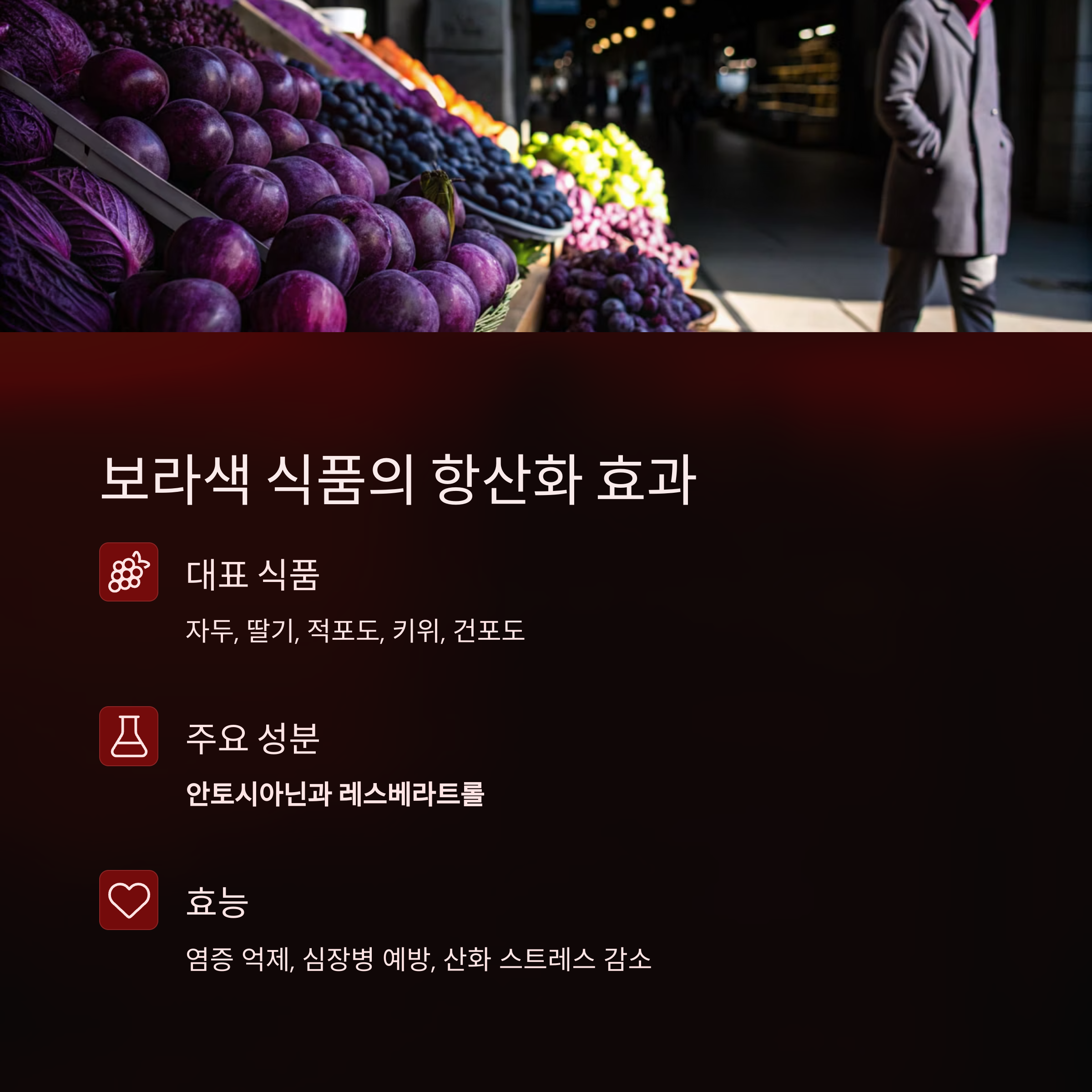 | 보라색 | 자두, 포도, 키위 | 항산화 작용, 심장병 예방 |