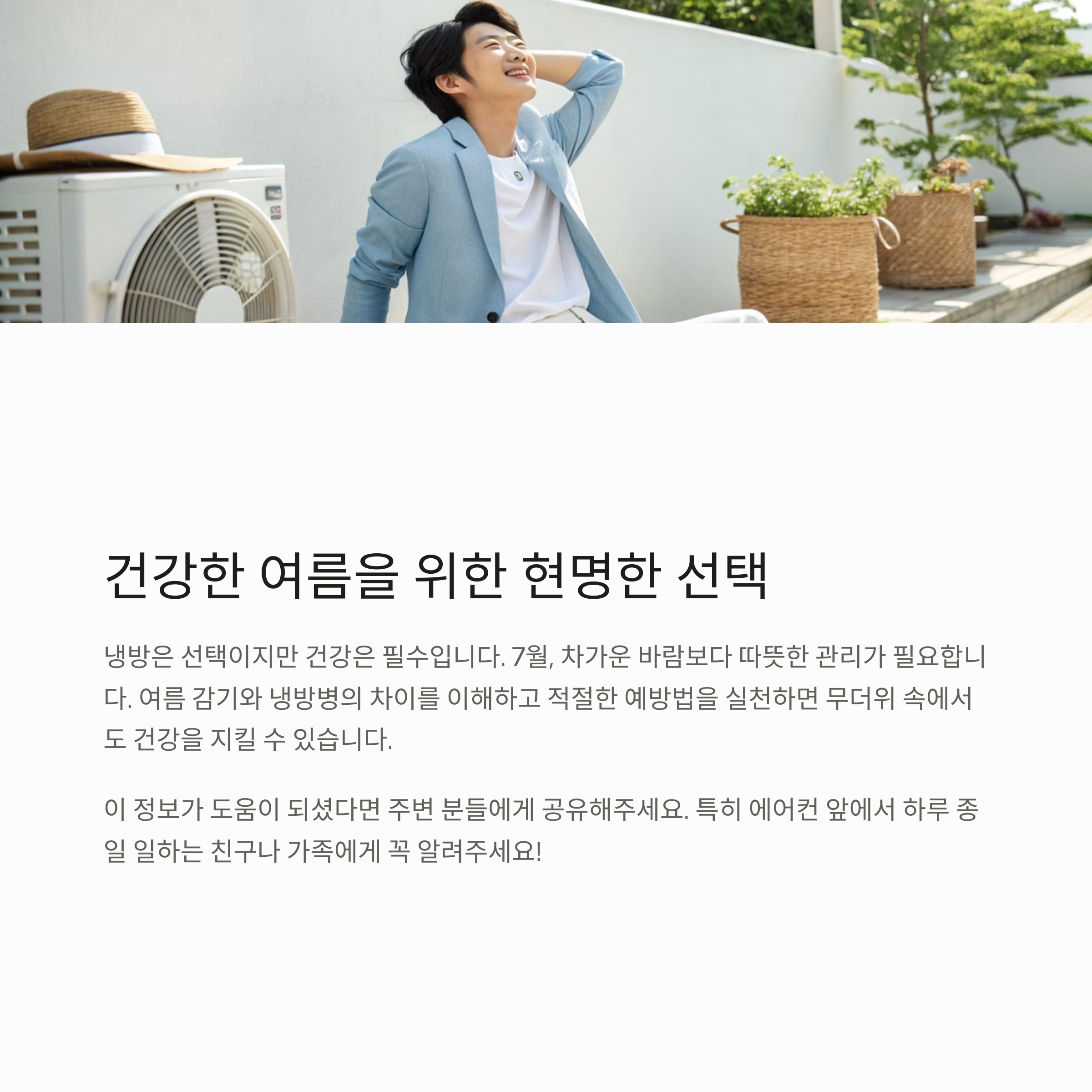 냉방은 선택이지만 건강은 필수입니다. 7월, 차가운 바람보다 따뜻한 관리가 필요합니다.