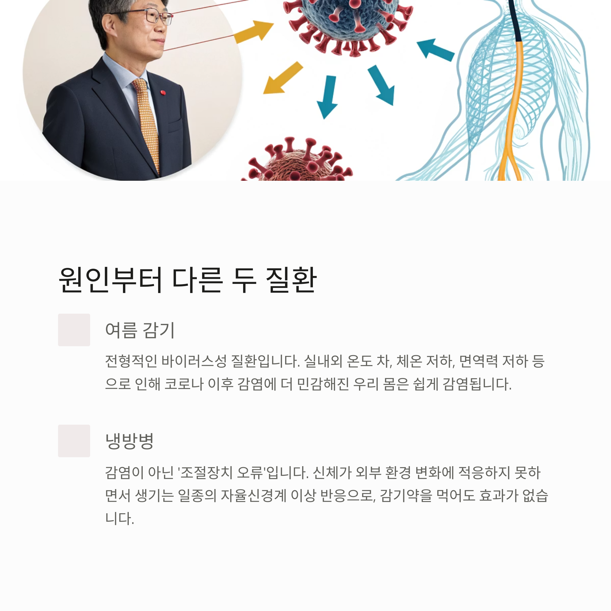 반면 냉방병은 감염이 아닌 ‘조절장치 오류’입니다.