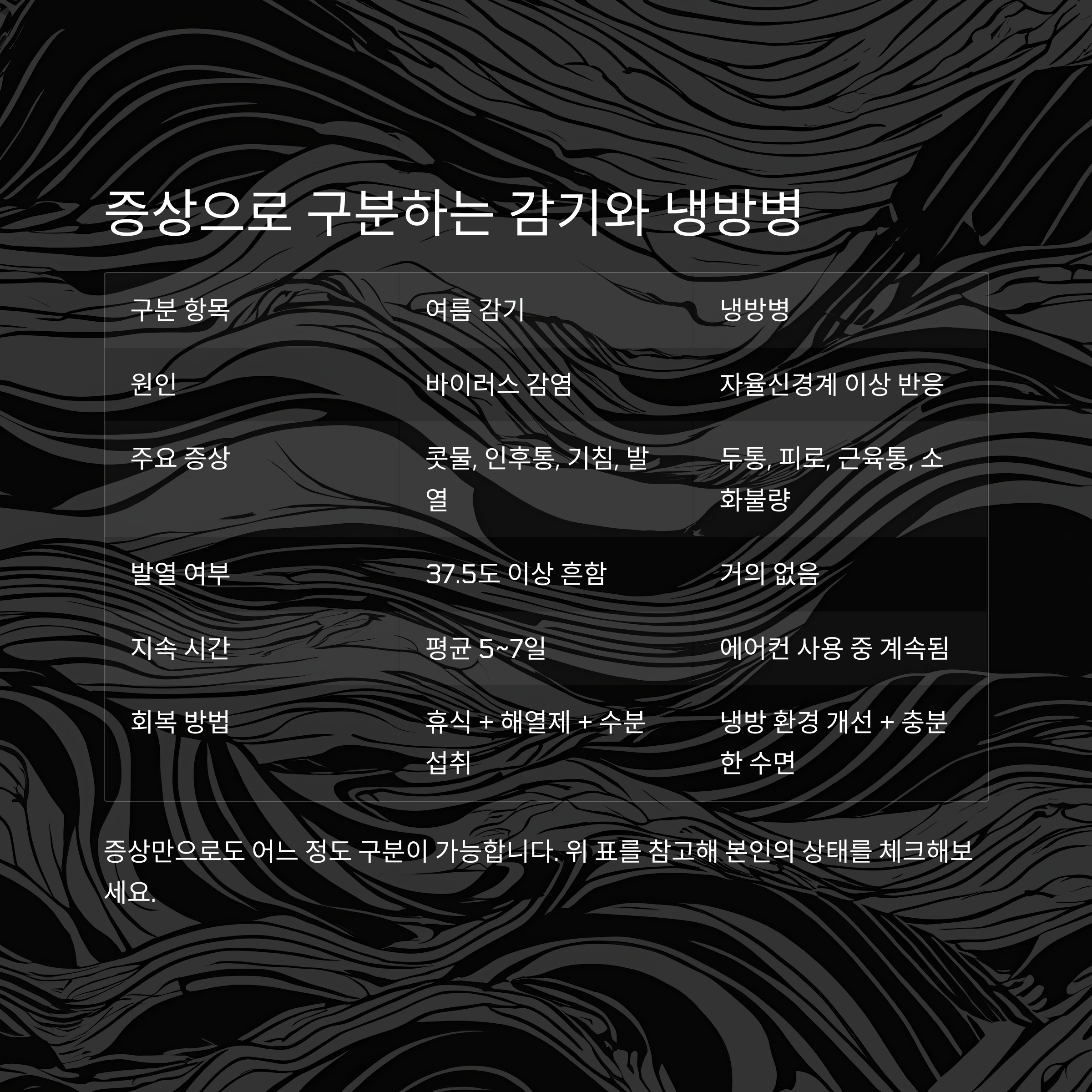 7월 무더위 속에서도 감기 증상으로 고생하는 사람들이 늘고 있습니다. 하지만 이때 흔히 겪는 증상이 감기인지, 냉방병인지 헷갈리는 경우가 많습니다. 둘 다 컨디션을 무너뜨리지만 원인과 치료, 예방법은 전혀 다릅니다. 본 글에서는 여름 감기와 냉방병의 미묘한 차이를 정확히 구분하고, 실생활에서 적용 가능한 예방 및 관리법까지 심층적으로 안내드립니다. 에어컨 없는 여름은 상상할 수 없지만, 그 대가로 건강을 잃지 않도록 지금부터 꼼꼼히 확인해보세요.