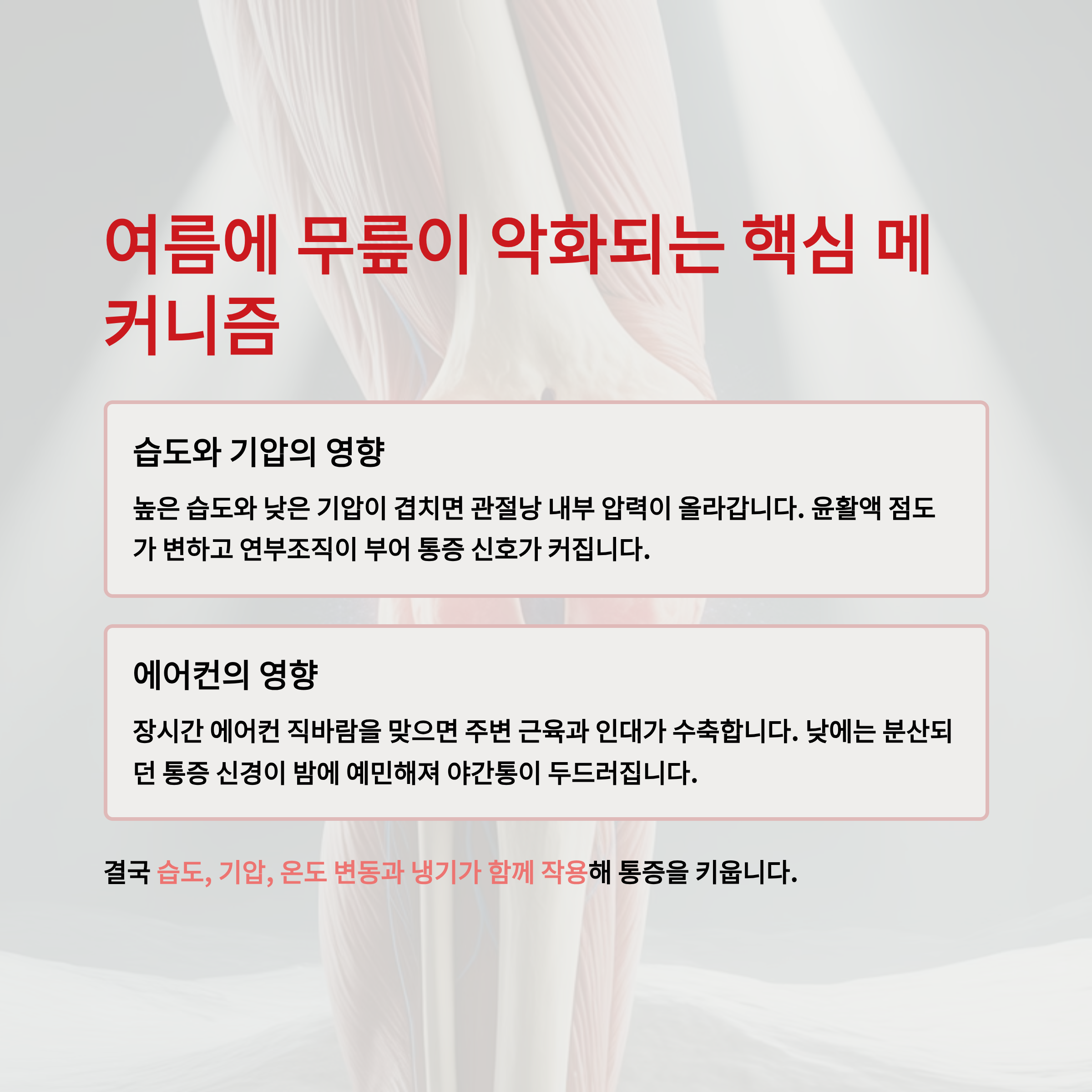 여름에 무릎이 악화되는 핵심 메커니즘 한눈 요약