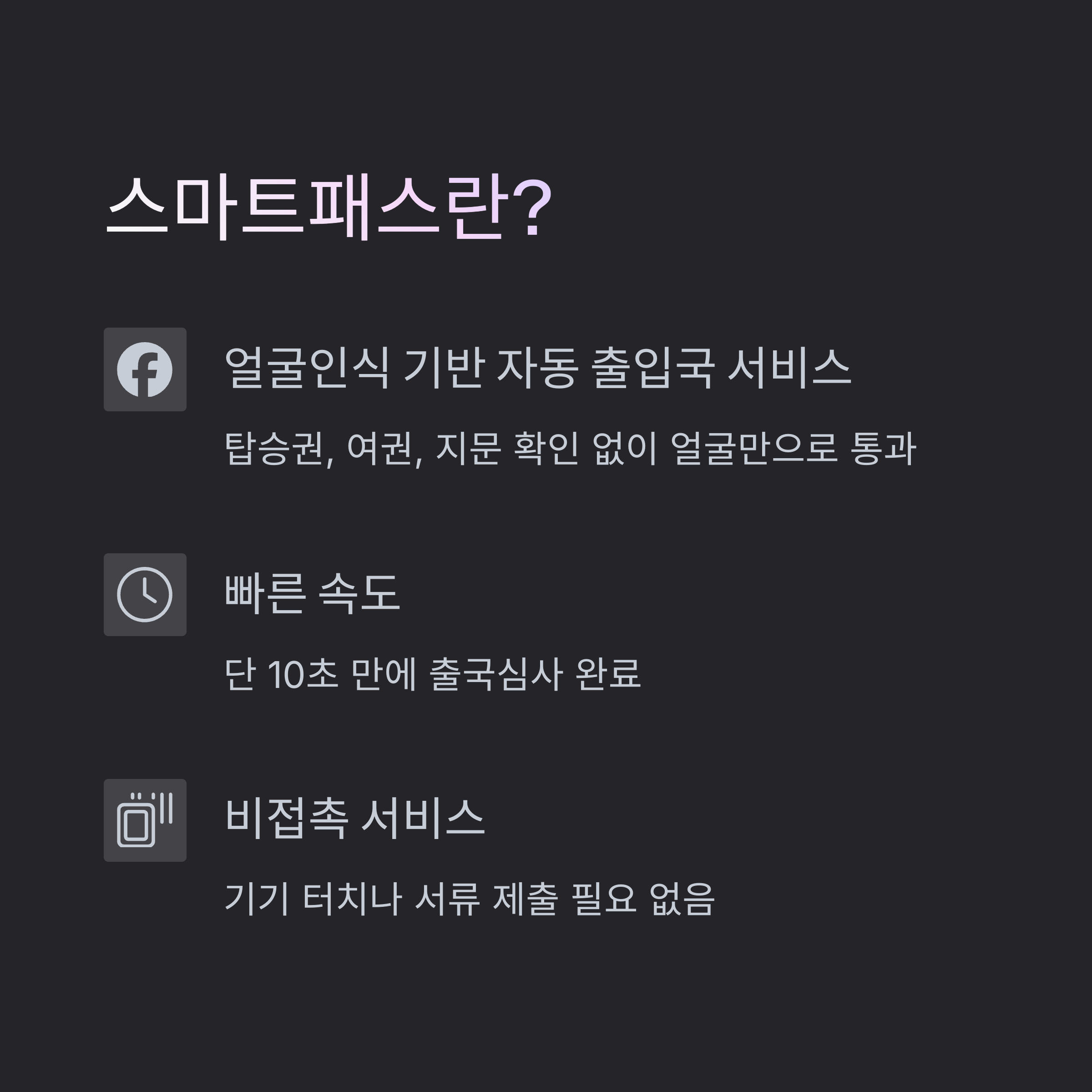 인천국제공항 스마트패스는 얼굴인식 기반의 자동 출입국 서비스입니다.