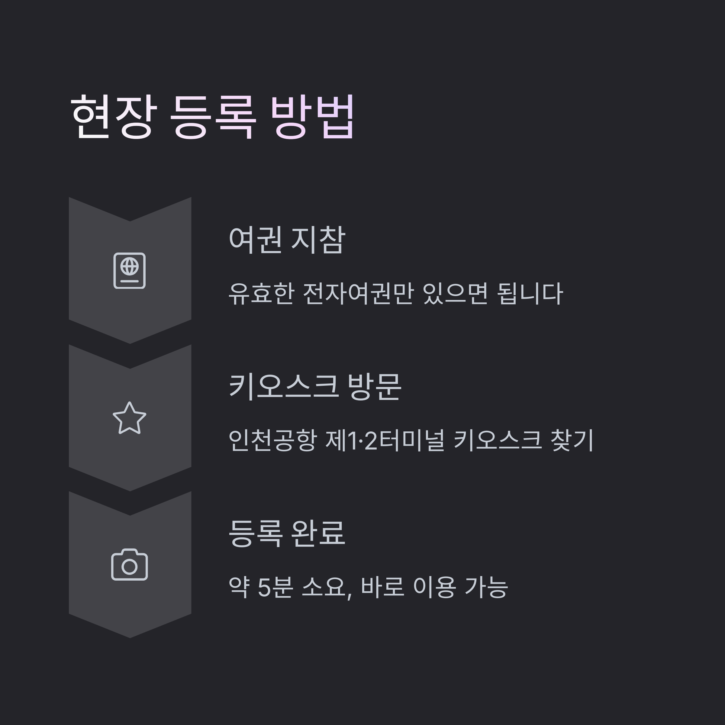 | 현장 등록 | 인천공항 제1·2터미널 키오스크 | 약 5분 |